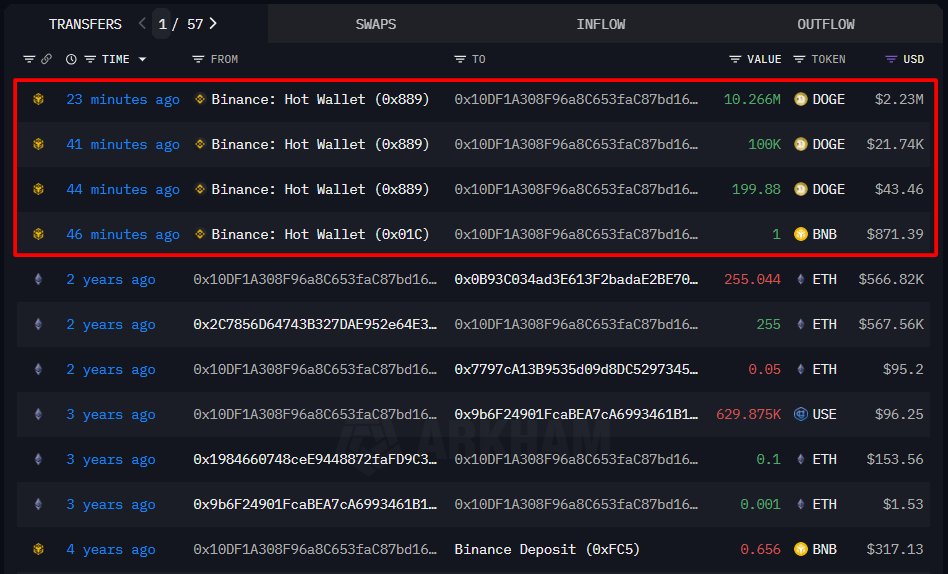 Di sisi lain, wallet yang sudah tidak aktif hampir dua tahun tiba-tiba aktif kembali. Berdasarkan data on-chain, dompet tersebut menarik 10.366.683 DOGE (setara $2,25 juta) dari Binance hanya dalam satu transaksi.