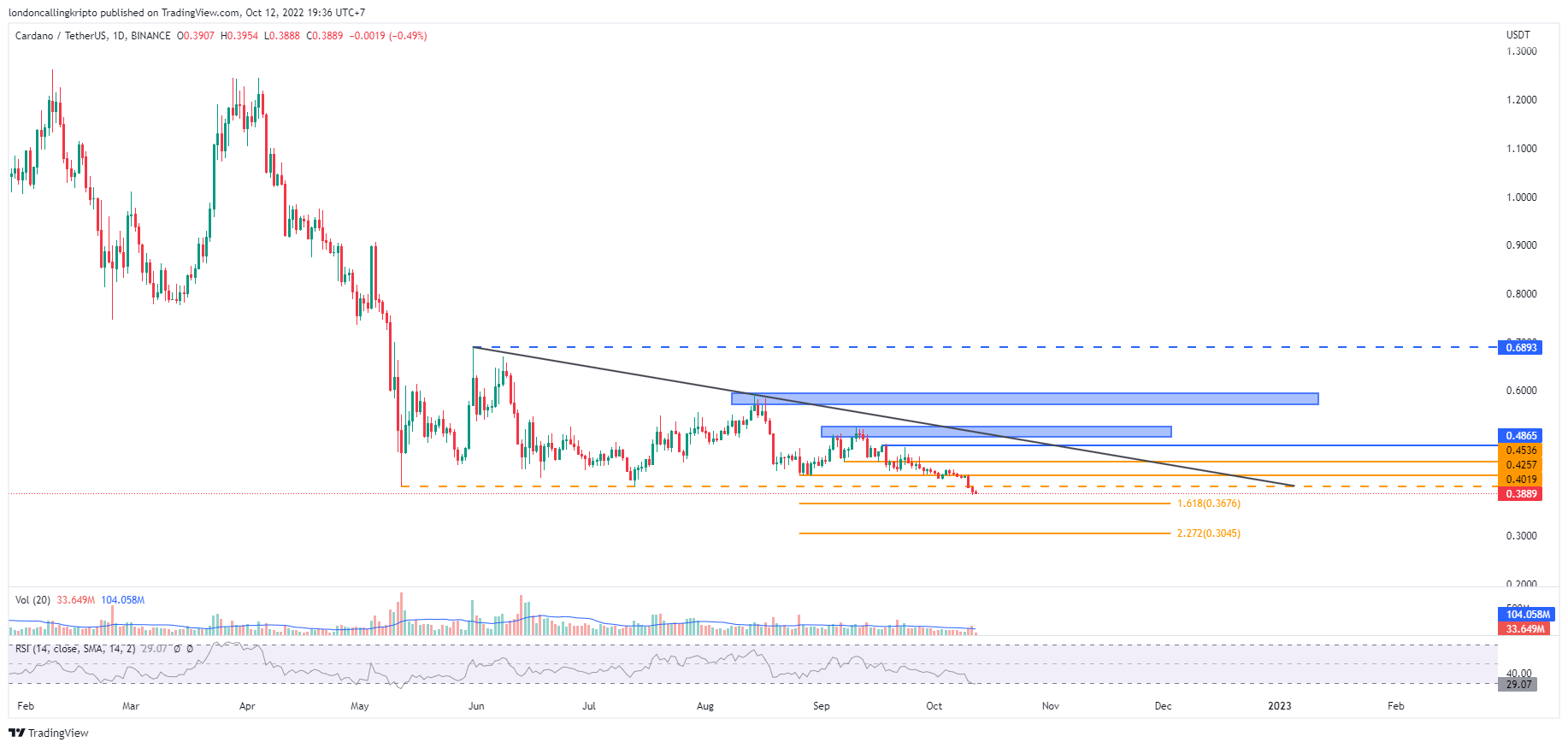 Kandil harian 10 Oktober ditutup dibawah major support yang merupakan harga terendah sementara tahun 2022 dan membuat para holder gelisah karena apabila harga ADA valid breakdown, kemungkinan penurunan harga akan berlanjut dan membentuk major support baru pada tahun 2022.