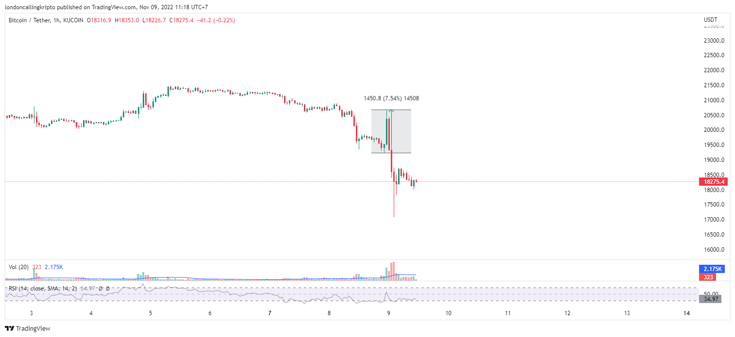 Bitcoin sebagai aset dengan kapitalisasi terbesar, naik tajam (pump) sebesar 7,54% hanya dalam waktu dua jam, dari level $19.230 naik hingga $20.681. Selain Bitcoin, aset kripto lainnya (altcoin), seperti ETH dan BNB mengalami hal serupa.