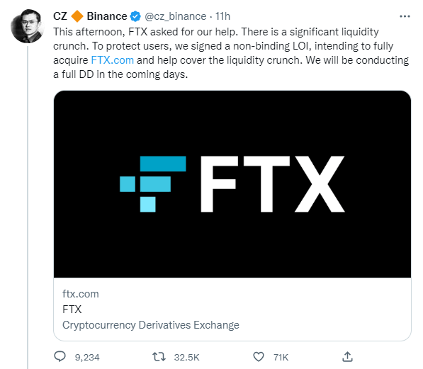 CZ mengumumkan akan membantu FTX dalam menghadapi krisis likuiditas. Aksi tersebut terealisasi setelah Binance dan FTX menandatangani Letter of Intent (LOI) yang tidak mengikat untuk mengakuisisi FTX.