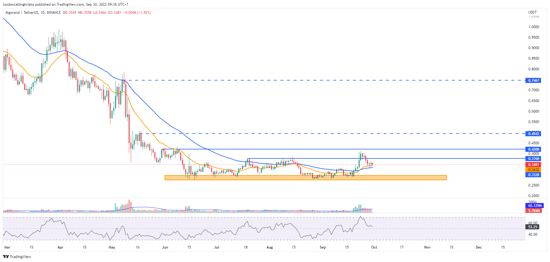 Resistance pada level $0,3768 menjadi target naik terdekat apabila pergerakan harga ALGO kembali bounce dan target naik selanjutnya berada pada level $0,4208 apabila berhasil breakout dari resistance terdekatnya.