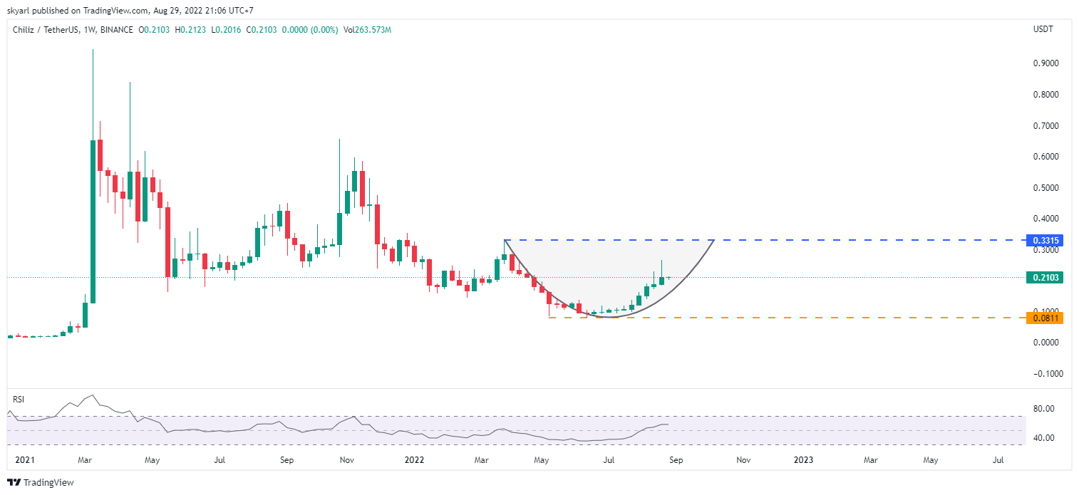 Pergerakn harga Chilliz terlihat sedang membentuk cup pada pola cup and handle. Target kenaikan altcoin ini berada pada level $0,3315, dan major support berada pada penutupan kandil mingguan 13 Juni di level $0,0811.