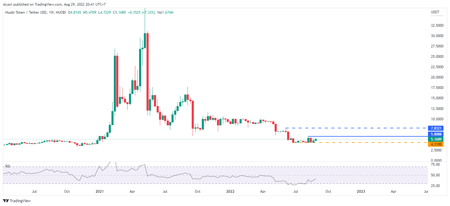 Major support HT berada pada level $4,3100 yang merupakan penutupan kandil minggu pada 27 Juni 2022. Resistance pada level $5,8088 menjadi target naik terdekat, jika berhasil breakout, maka target utama berada pada level $7,8321.