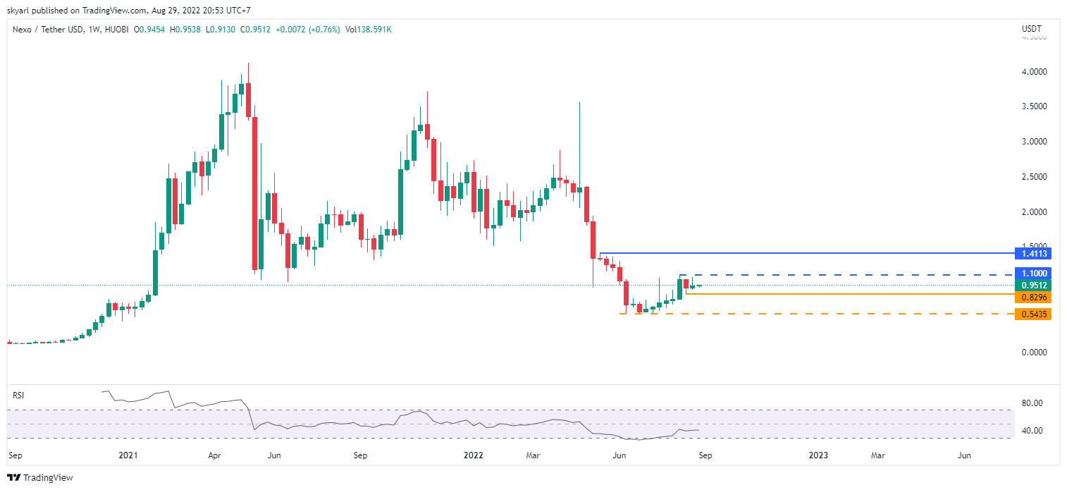 Target naik terdekat Nexo berada pada level $1,1 dengan kenaikan utama berada pada level $1,4113 jika pergerakan harga Nexo berhasil breakout. Support terdekat berada pada level $0,8296 dan major support Nexo berada pada level $0,5435.
