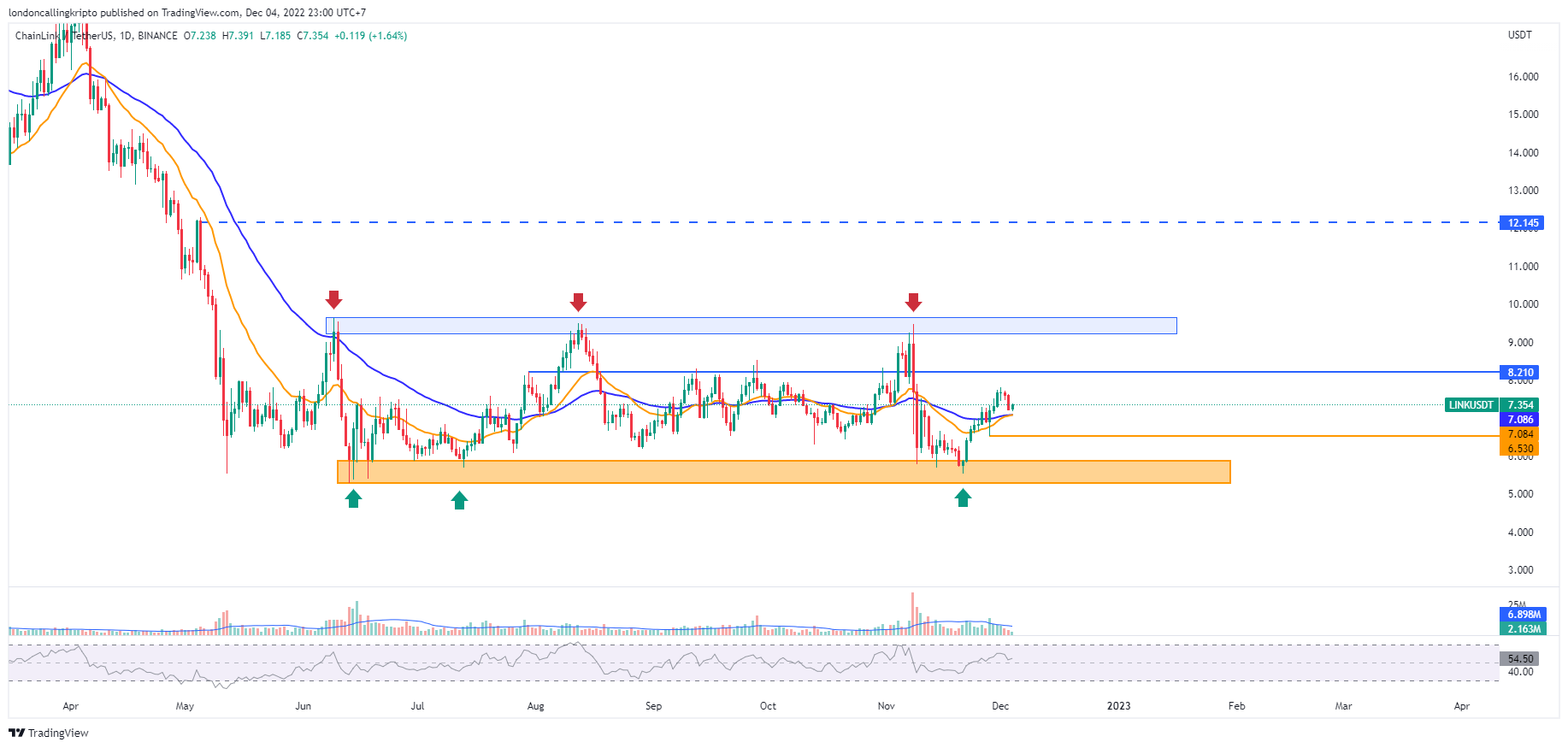 Harga terendah pada penutupan kandil harian 28 November di level $6,530 menjadi titik support selanjutnya, apabila pergerkan harga LINK berhasil breakdown tahanan terdekatnya.