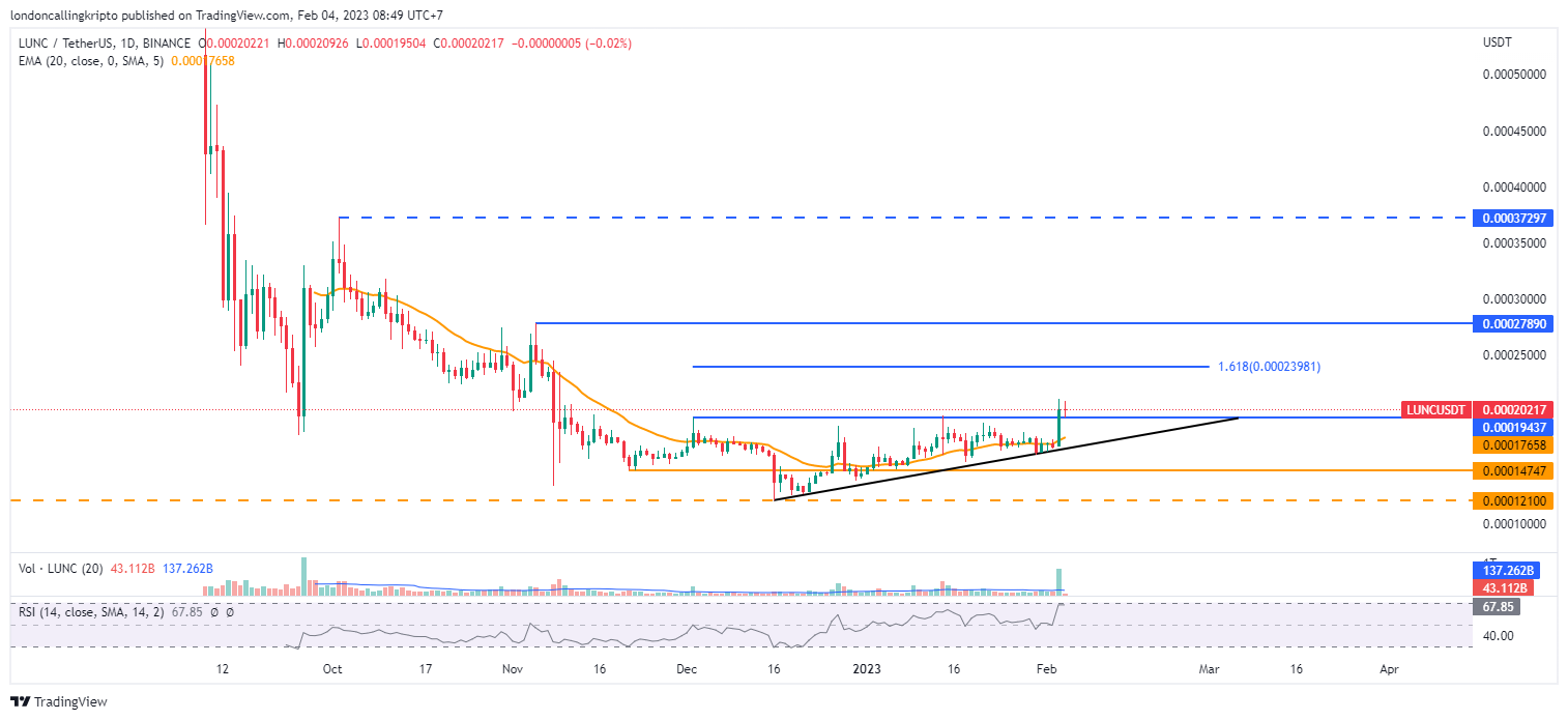 LUNC/USDT daily chart Binance. Source: TradingView. By: Arli Fauzi.