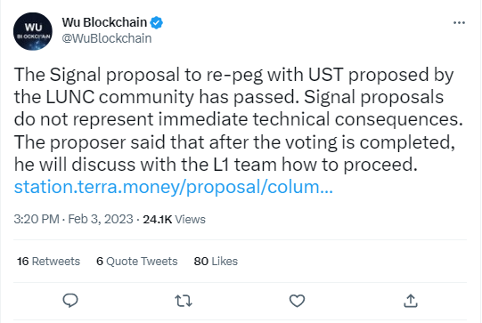 Kondisi bullish tersebut berhubungan dengan berita dari WooBlockchain di Twitter, tentang proposal signal re-peg UST yang diajukan oleh komunitas LUNC telah disahkan.