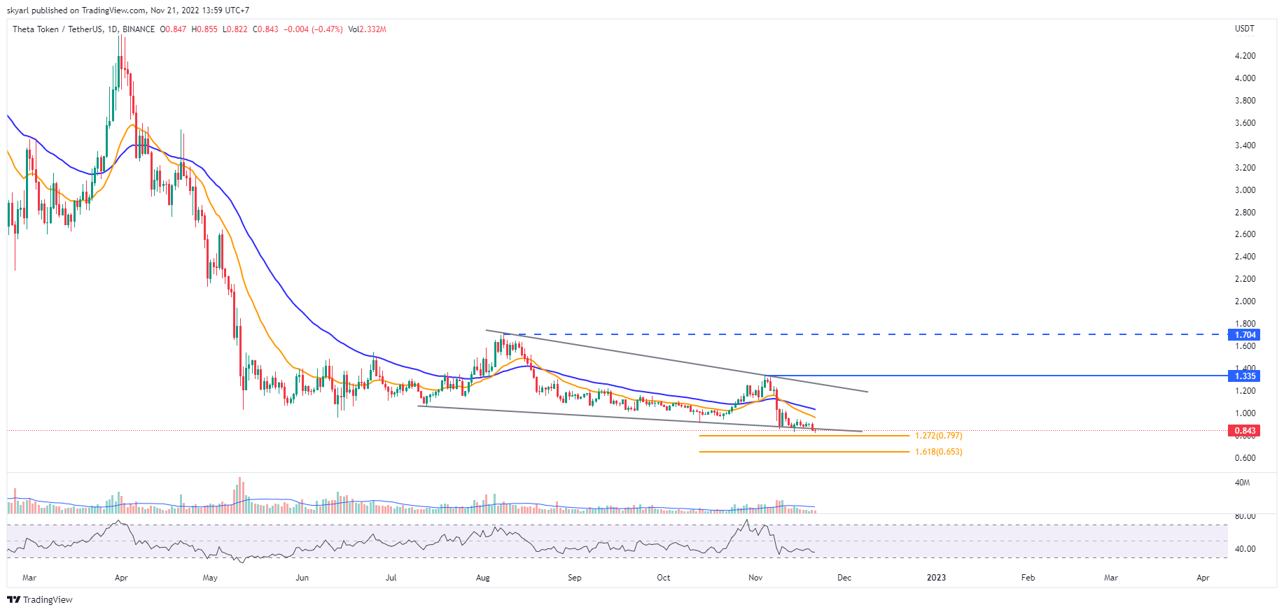 Pergerakan harga THETA mengalami penurunan sebesar 37,64% pada periode 6-14 November, dari harga $1,342 turun tajam (dump) hingga membentuk harga terendah sementara yang baru pada tahun 2022 dan menjadi major support saat ini di level $0,824.