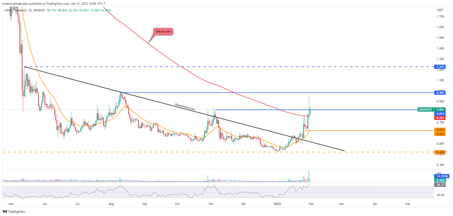 Apabila pergerakan harga MINA berhasil breakoput, maka harga tertinggi pada penutupan kandil harian 9 Agustus di level $0,982 menjadi target naik selanjutnya.