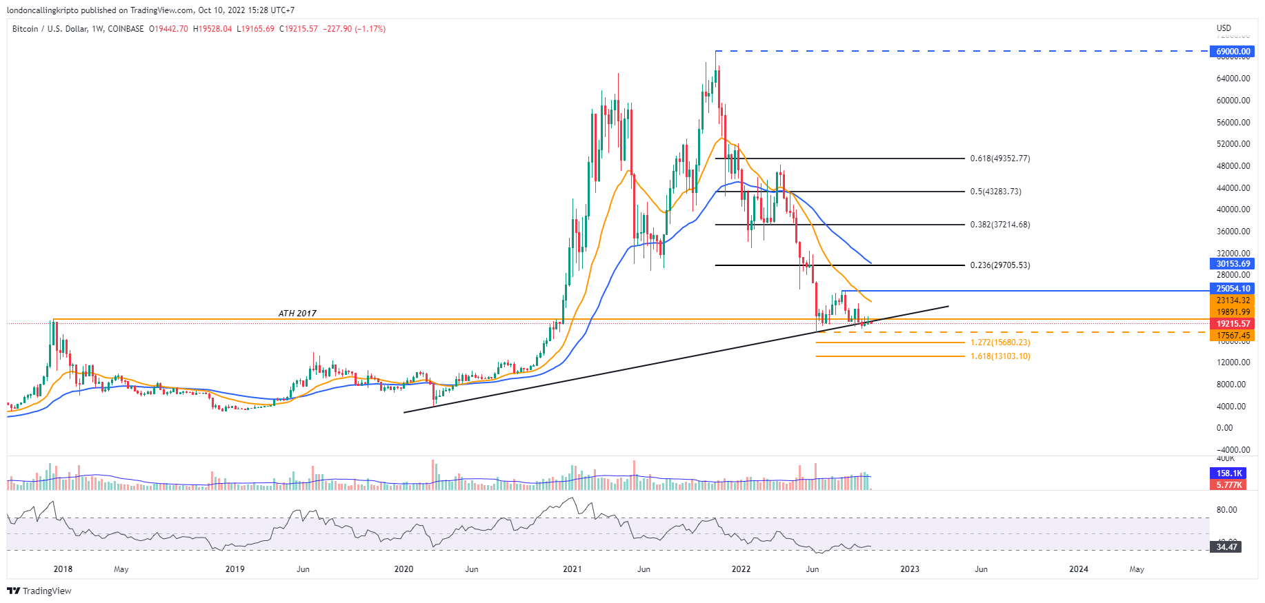 Major support yang merupakan harga terendah sementara Bitcoin pada tahun 2022 di level $17.567 menjadi tahanan yang cukup solid untuk menahan laju penurunan harga apabila pergerakan harga Bitcoin mengalami rejection pada ascendling line dan ATH 2017 nya.
