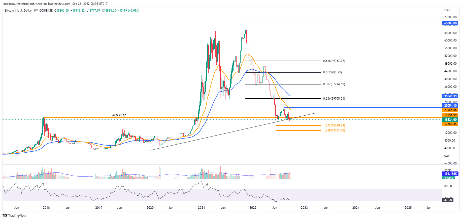 Pergerakan harga Bitcoin perlahan bergerak turun menuju major support pada level $17.567 yang merupakan harga terendah sementara pada tahun 2022.