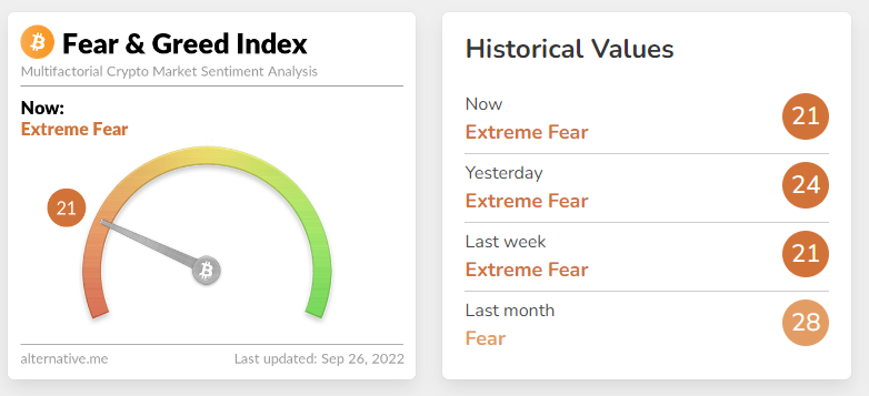 Fear and greed (F&G) index dalam beberapa pekan terakhir berada pada level extremen fear. Pagi ini F&G index masih ditutup rendah pada level 21, lebih rendah dari akhir pekan kemarin. Rendahnya penutupan pada F&G index mengindikasikan sentimen market kripto masih dalam tahap harap-harap cemas.