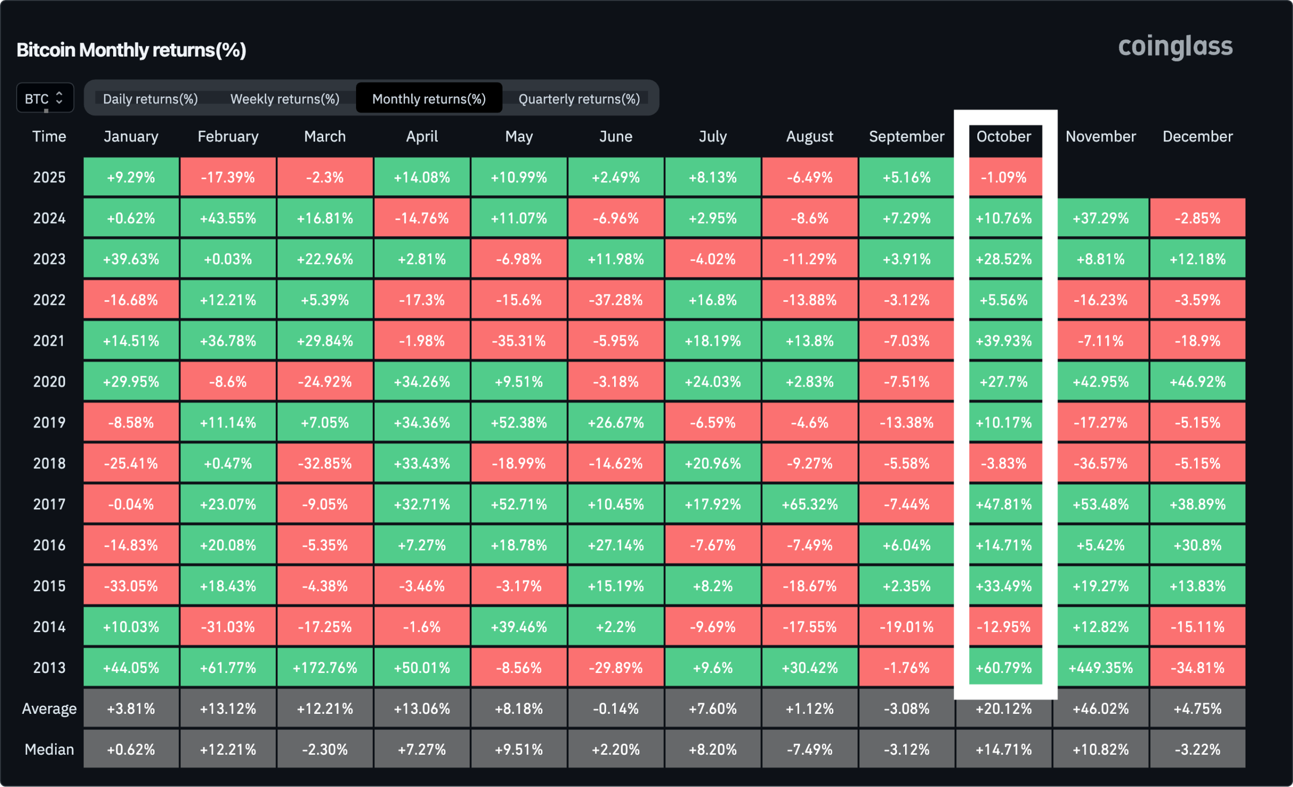 Secara historis, Oktober menjadi bulan hijau bagi Bitcoin dalam 10 dari 12 tahun terakhir, dengan rata-rata kenaikan di atas 20%. Namun, menurut data Coinglass, sejauh ini Bitcoin baru mencatatkan kenaikan 1,14% sepanjang bulan ini.