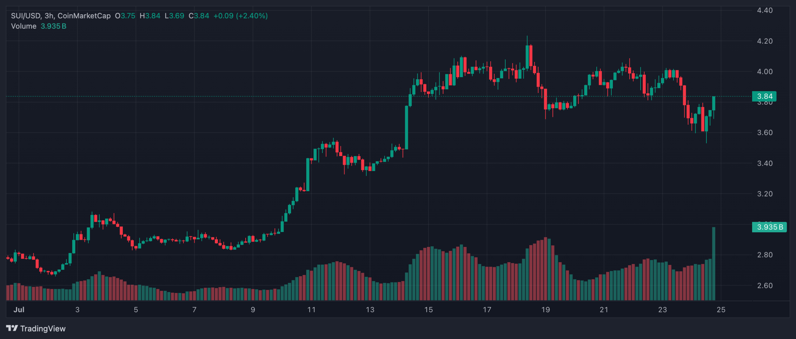 SUI saat ini diperdagangkan di kisaran $4 dengan lonjakan volume harian ke $1,6 miliar dan kenaikan mingguan 1,7%. Lonjakan volume ini menunjukkan minat investor yang meningkat seiring dengan pemulihan pasar altcoin secara keseluruhan.