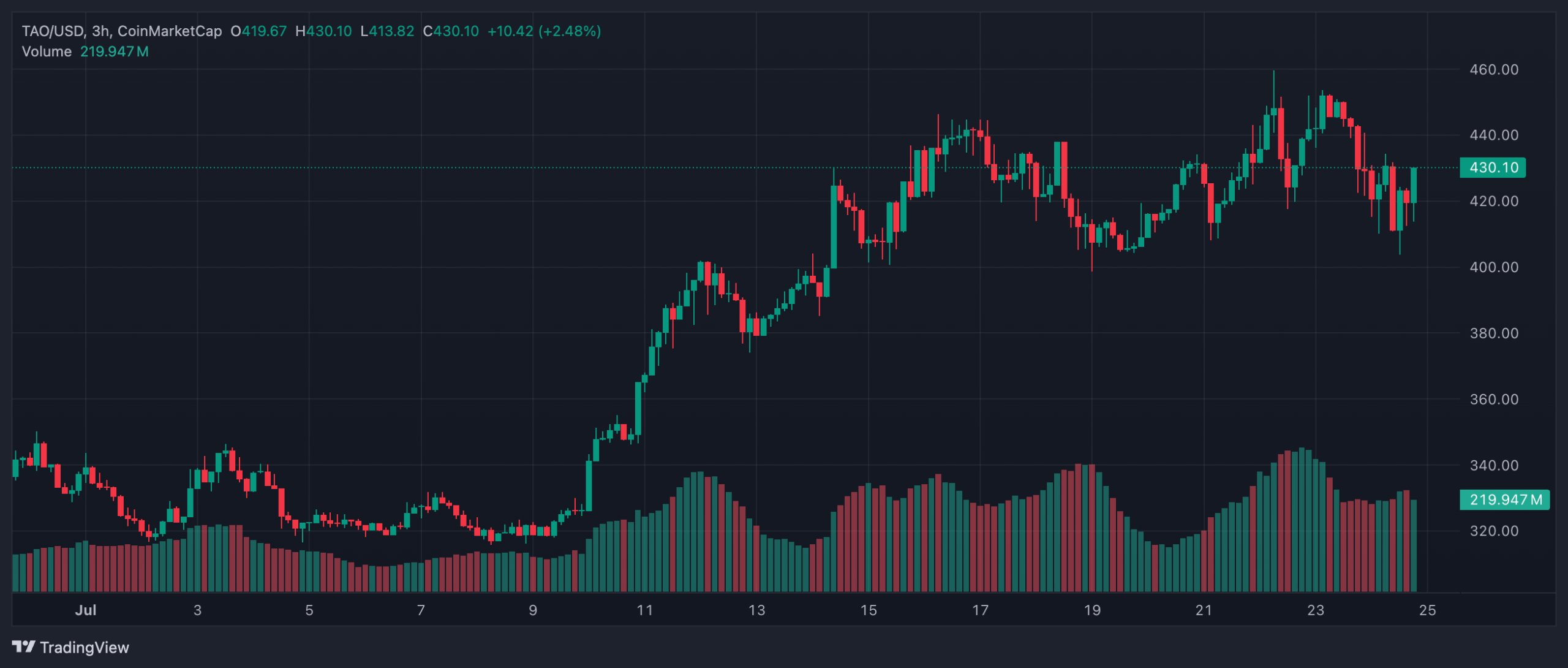 Bittensor (TAO) mencatat rebound 50% dari level terendah bulan Juni dan kini diperdagangkan stabil di atas $430. Indikator teknikal menunjukkan momentum bullish yang kuat, termasuk formasi Golden Cross (perpotongan EMA 50 dan EMA 100) serta RSI di level 64.