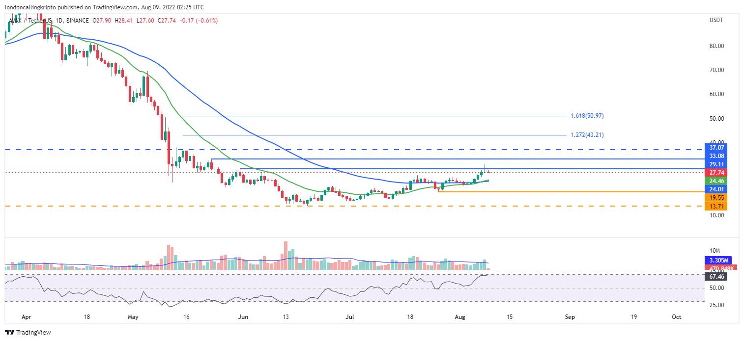 Jika pergerakan harga AVAX mampu breakout resistance pada level $29,11, maka target kenaikan selanjutnya berada pada level $33,08. Day-20 EMA pada level $24,5 masih menjadi support solid untuk menahan laju peenurunan AVAX apabila mengalami koreksi.