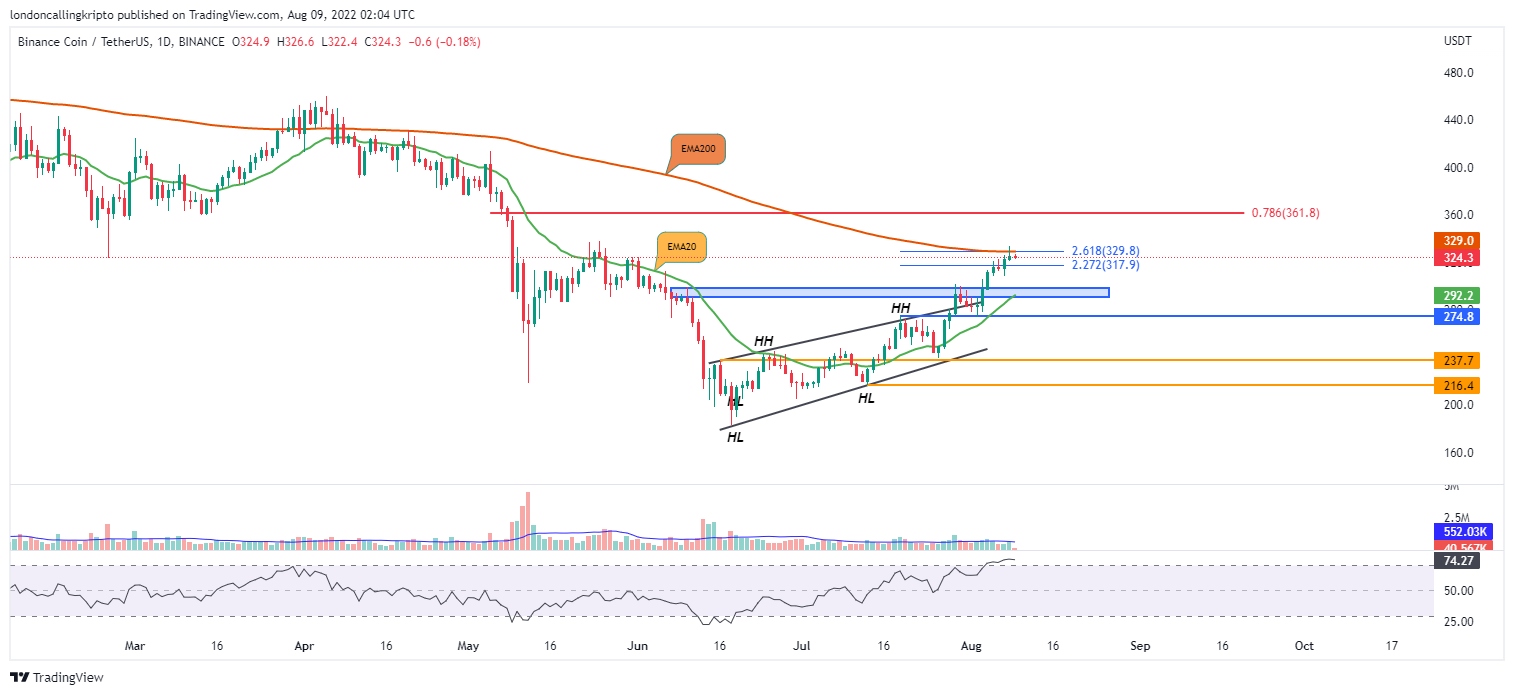 Laju kenaikan BNB tertahan di day-200 EMA pada level $329 yang menjadi resistance dinamis yang kuat dari winter season tahun ini. Day-200 EMA menjadi kunci untuk merubah major trend dan kemungkinan bisa mengakhiri fase bearish pada BNB.