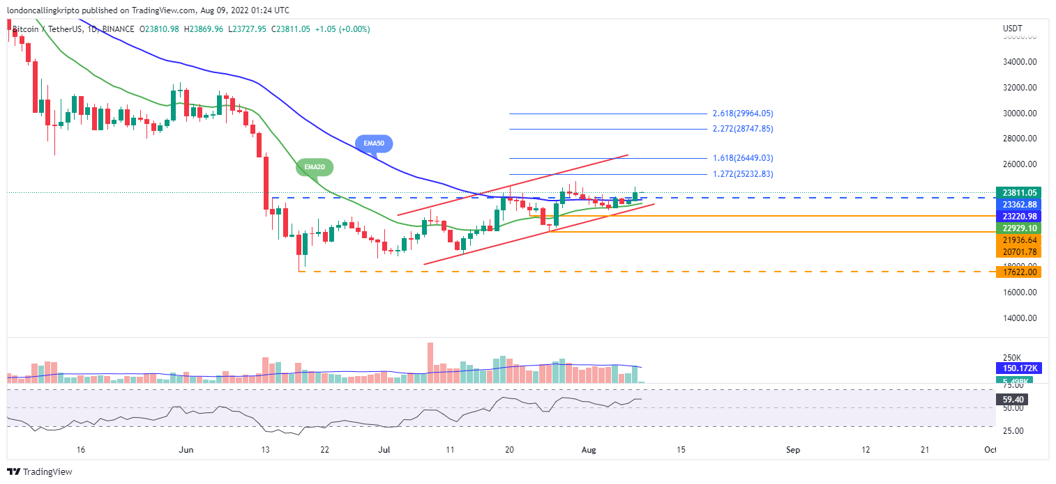 Pergerakan harga Bitcoin berhasil breakout resistance pada level $23.362 dan kandil harian selanjutnya akan menjadi konfirmasi. Target kenaikan selanjutnya berada pada level $25.232, Jika harga Bitcoin kembali melanjutkan laju kenaikan. Day-20 EMA pada level $22.930 masih menjadi support yang solid untuk menahan laju penurunan Bitcoin apabila harga koreksi.