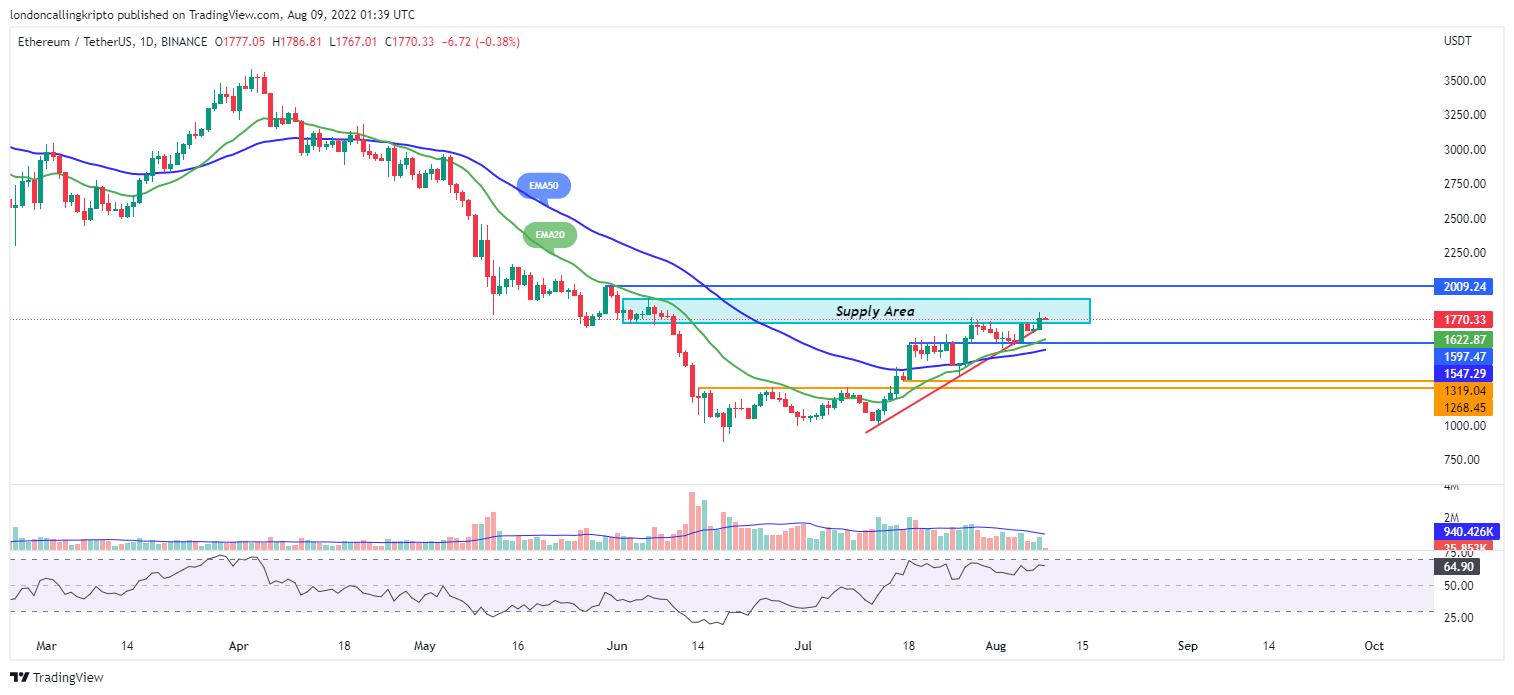 Sementara Eter mengikuti pola yang sama, mencapai tertinggi dua bulan di atas $1.800 pada hari sebelumnya sebelum mengambil pijakan sedikit di bawah level ini.