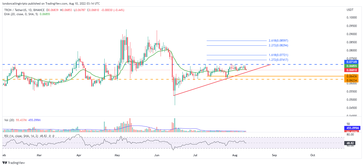 TRX kembali harus tertahan resistance pada level $0,07149 pada laju kenaikan 29 Juli. Hal tersebut menjadi kali kedua harga TRX mengalami penolakan di titik tersebut dan kembali turun. Kandil harian TRX ditutup merah dengan penurunan sebesar 2,43%.