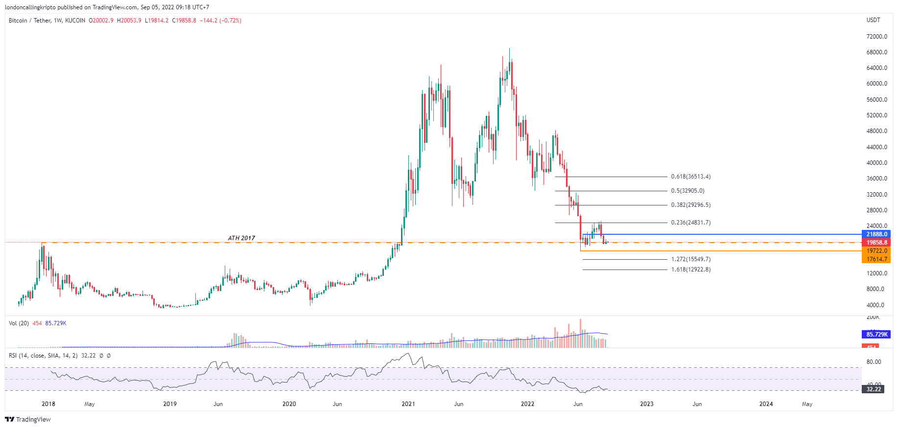 BTC/USDT weekly chart Kucoin. Source: TradingView. By: Arli Fauzi