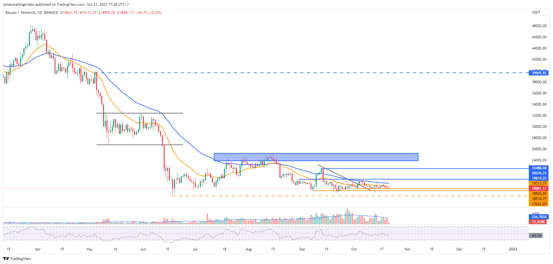 Penurunan harga Bitcoin masih tertahan support di level $18.920. Perlawanan terhadap laju turun seharusnya menguat pada titik ini dengan harapan harga bisa kembali naik.