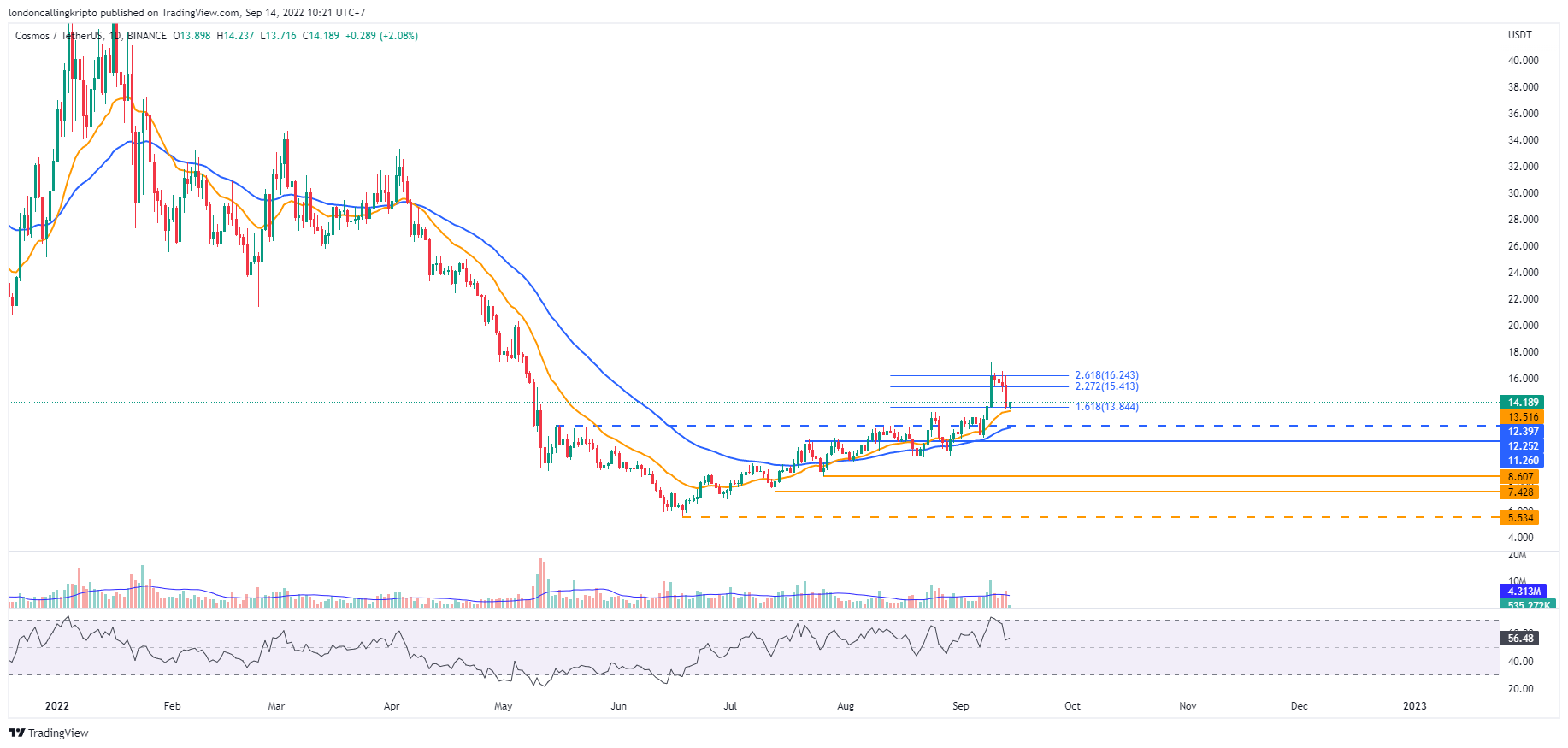 Laju bullish ATOM berhasil mencapai puncaknya pada 9 September dilevel $17,198. Resistance tersebut menjadi tahanan yang solid sehingga membalikan harga ATOM menjadi turun. Penurunan harga ATOM saat ini tertahan support pada level $13,844.