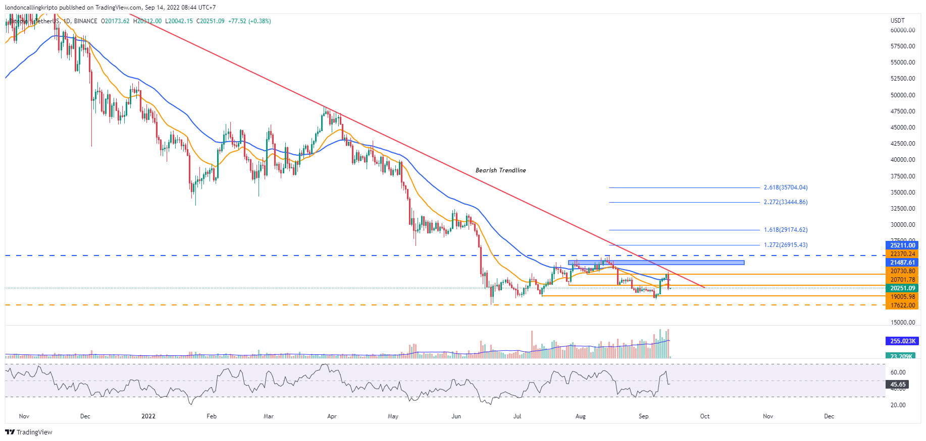 Laju naik Bitcoin tertahan resistance pada level $22.370 pada 12 September. Pergerakan harga Bitcoin turun cukup dalam hingga berhasil breakdown support pada level $20.701 yang saat ini menjadi resistance.