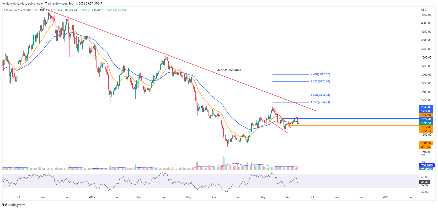 Menjelang “The Merge” harga ETH anjlok, turun sebesar 8,27%. Adanya aksi jual dengan jumlah yang cukup signifikan, ditandai dengan penutupan volume yang ditutup tinggi berada di atas rata-rata day-20 MA.