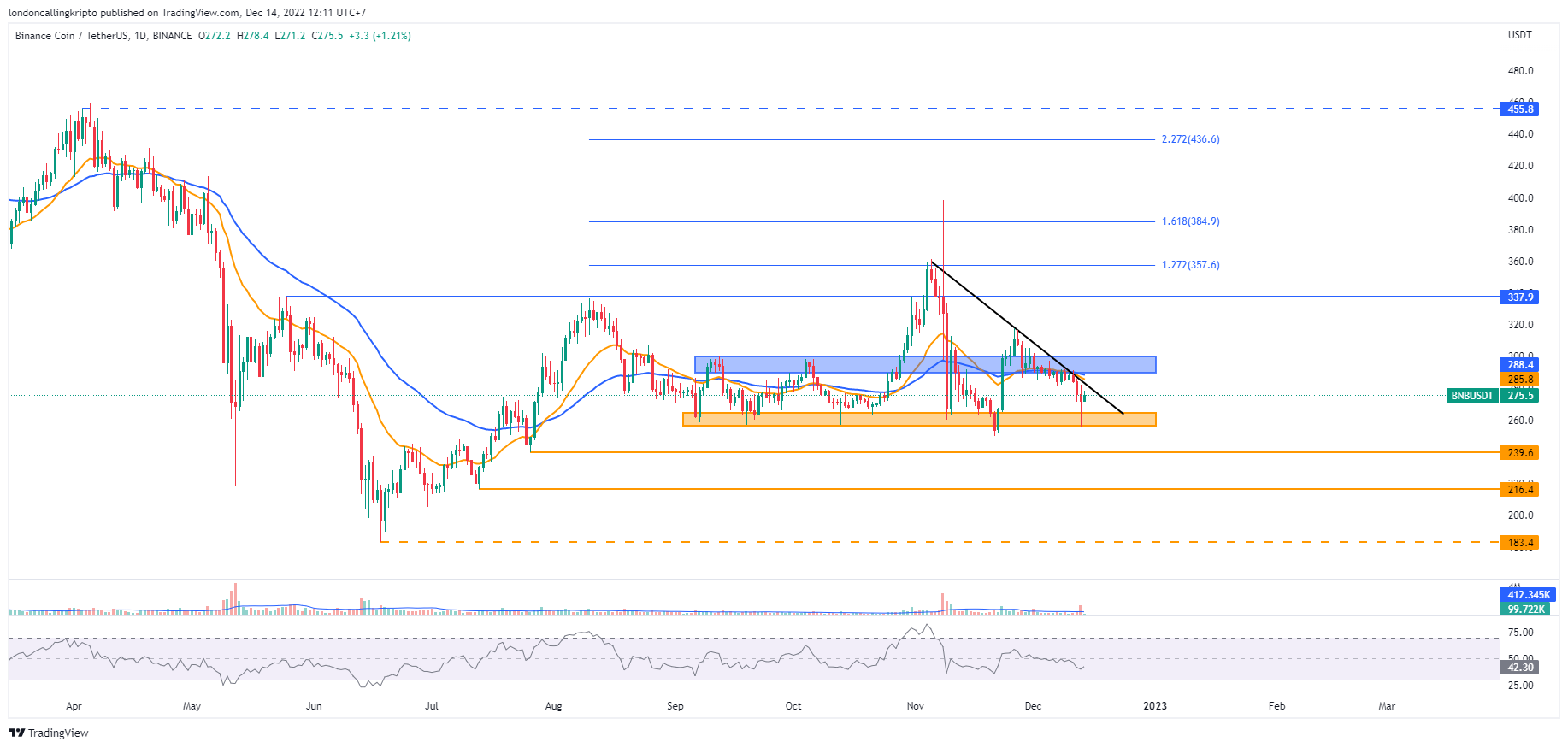Area resistance pada level $289,6-$300 menjadi target naik terdekat apabila pergerakan harga BNB berhasil descending triangle pattern-nya.