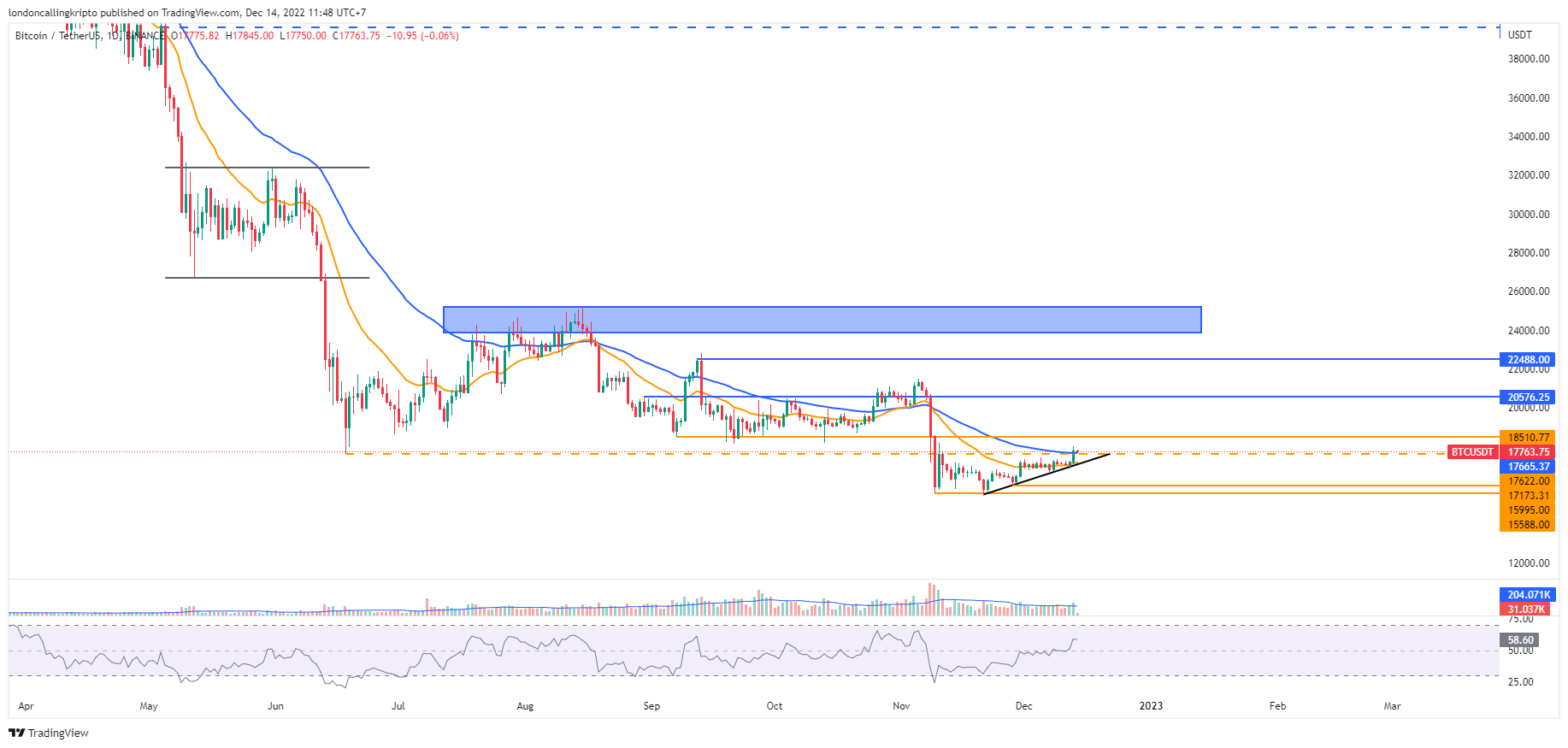 Bitcoin berhasil pumping setelah laju penurunan pada penutupan kandil 12 Desember tertahan ascending line. Kandil harian Bitcoin ditutup hijau dengan kenaikan yang cukup signifikan, sebesar 3,28%.