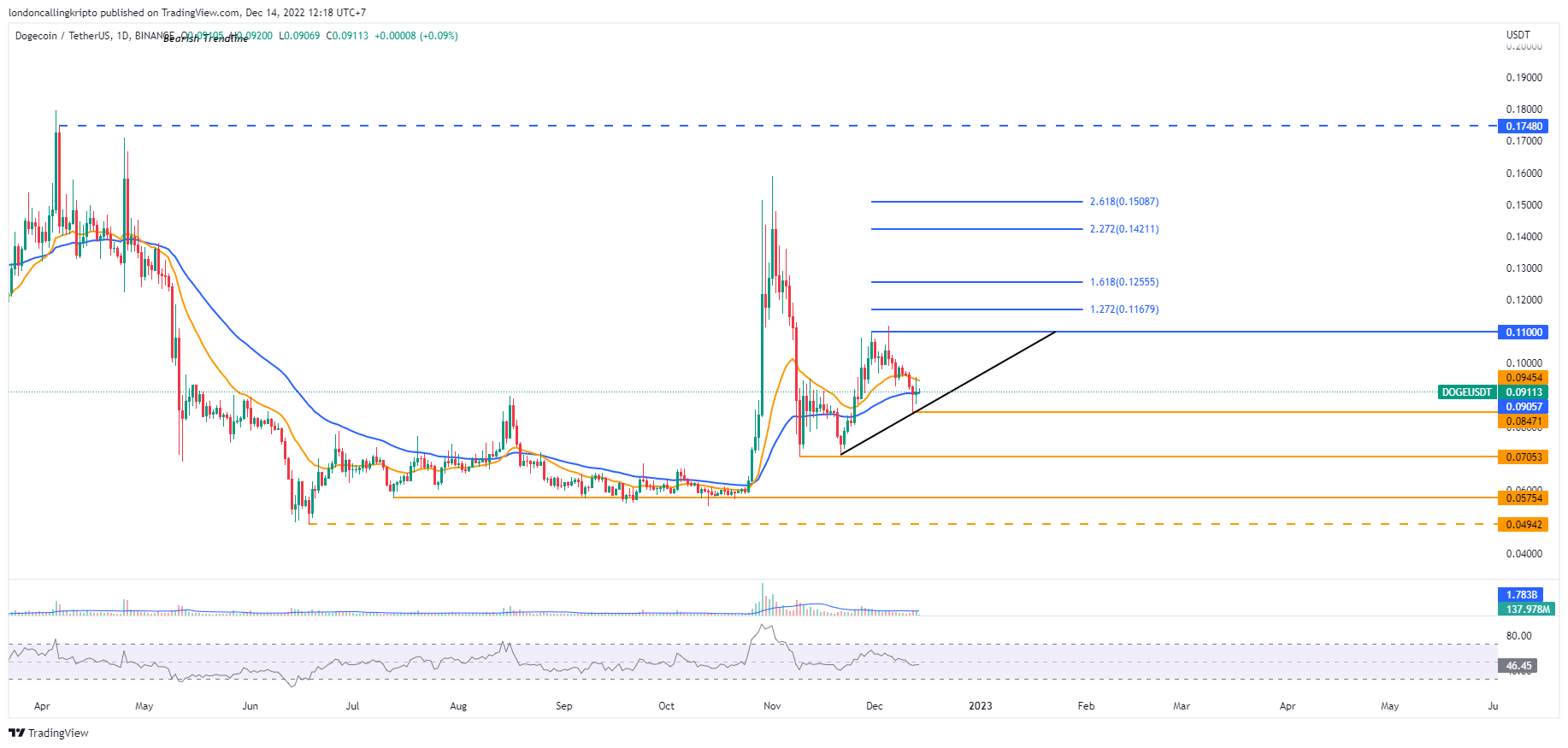 Harga tertinggi pada penutupan kandil harian 30 November di level $0,11000 menjadi target naik terdekat apabila pergerakan harga DOGE berhasil breakout 20-day EMA.