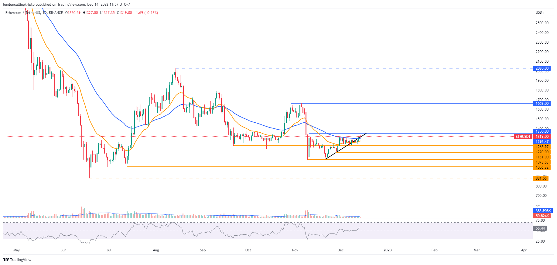 Kenaikan harga ETH masih tertahan resistance terdekat yang merupakan harga tertinggi pada penutupan kandil harian 10 November di level $1.350.