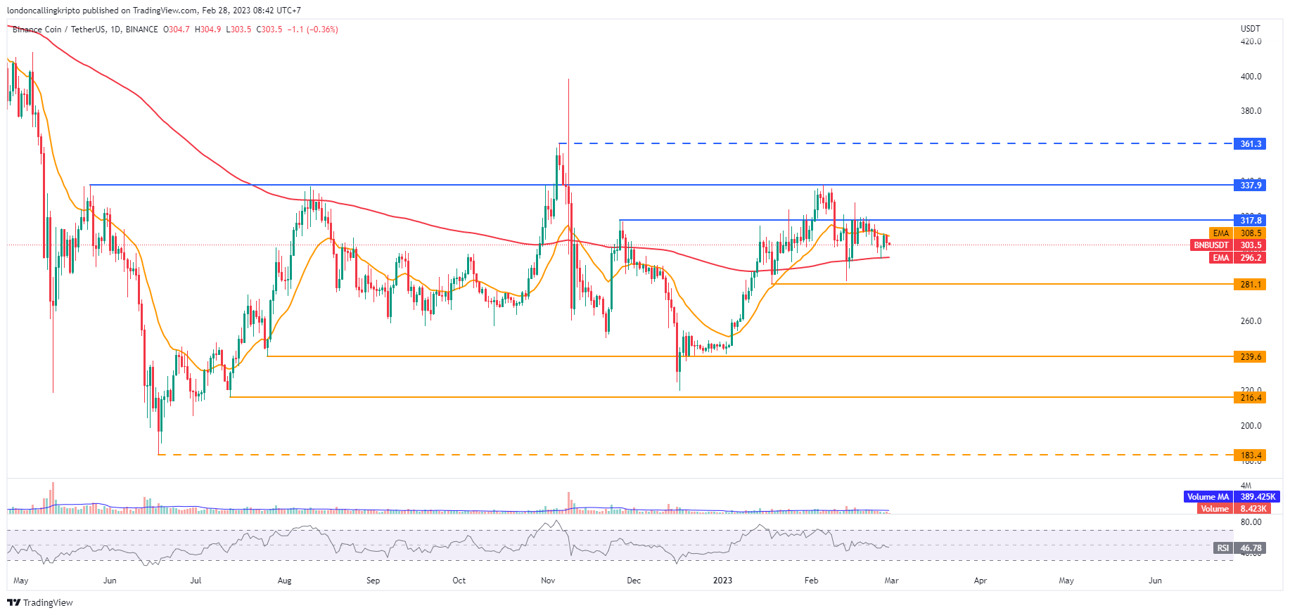Dinamis resistance pada 20-day EMA di level $308,5 masih menjadi penghalang yang cukup solid untuk laju naik BNB.
