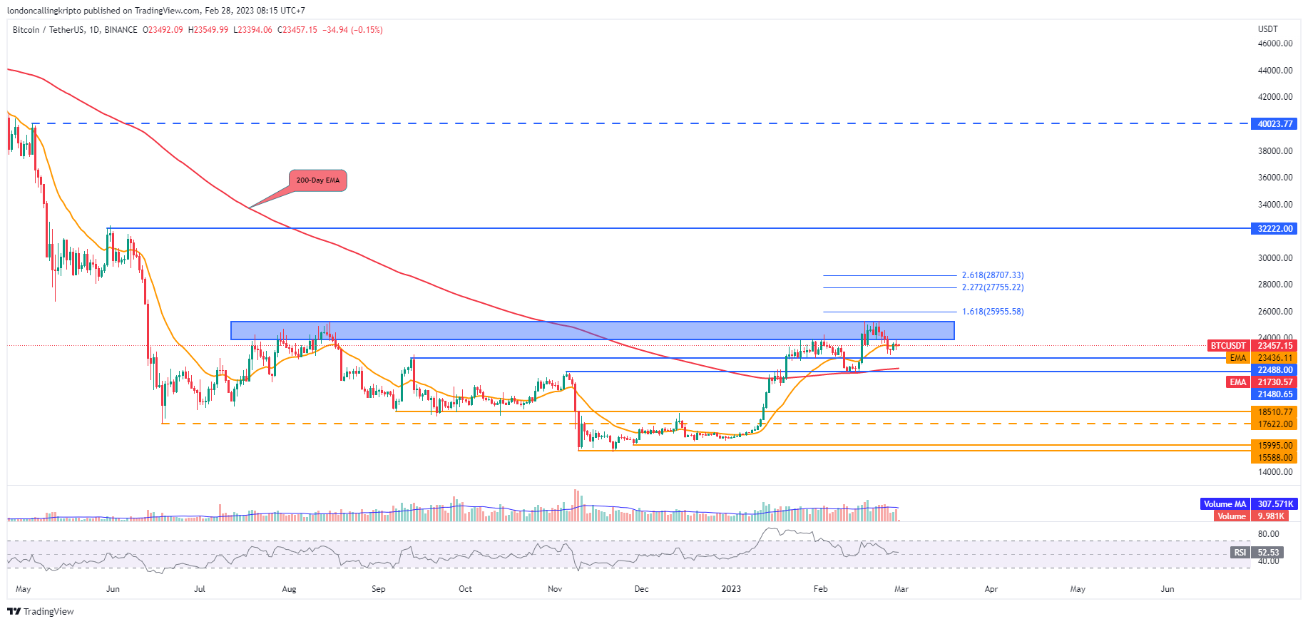 Target naik Bitcoin saat ini berada pada area supply di level $23.888-$25.198. Aksi beli dan volume perdagangan yang tinggi menjadi faktor utama untuk mendorong kenaikan harga lebih lanjut.