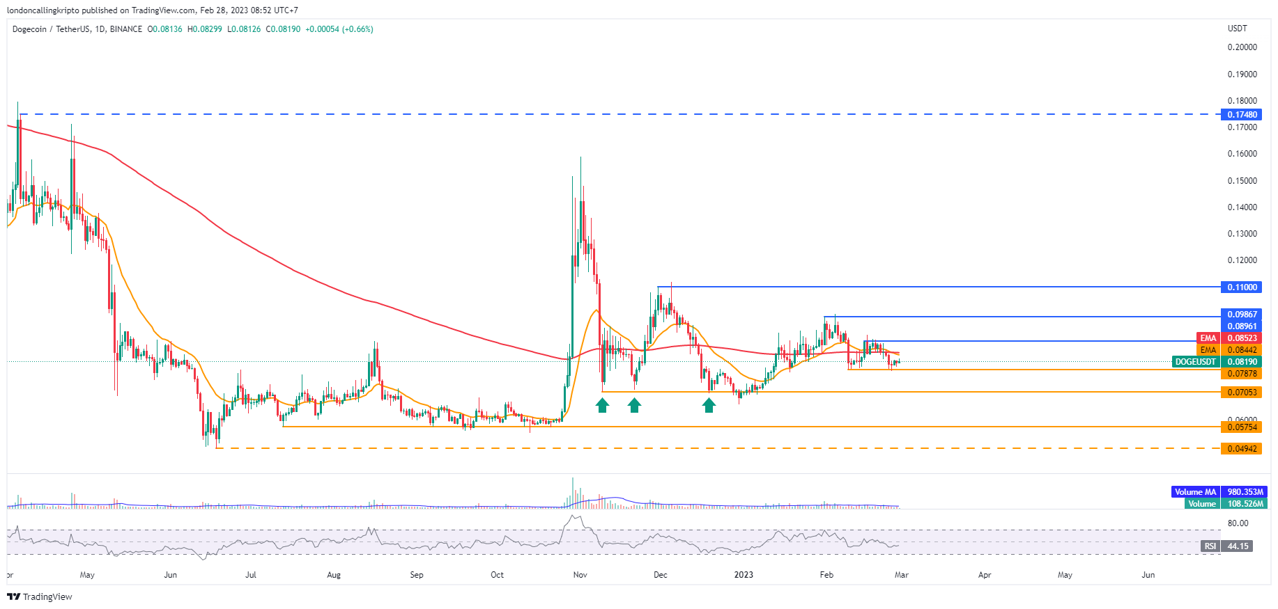 Harga DOGE kemungkinan akan kembali menyentuh resistance yang tercipta pada 31 Januari di level $0,09867 apabila berhasil breakout.