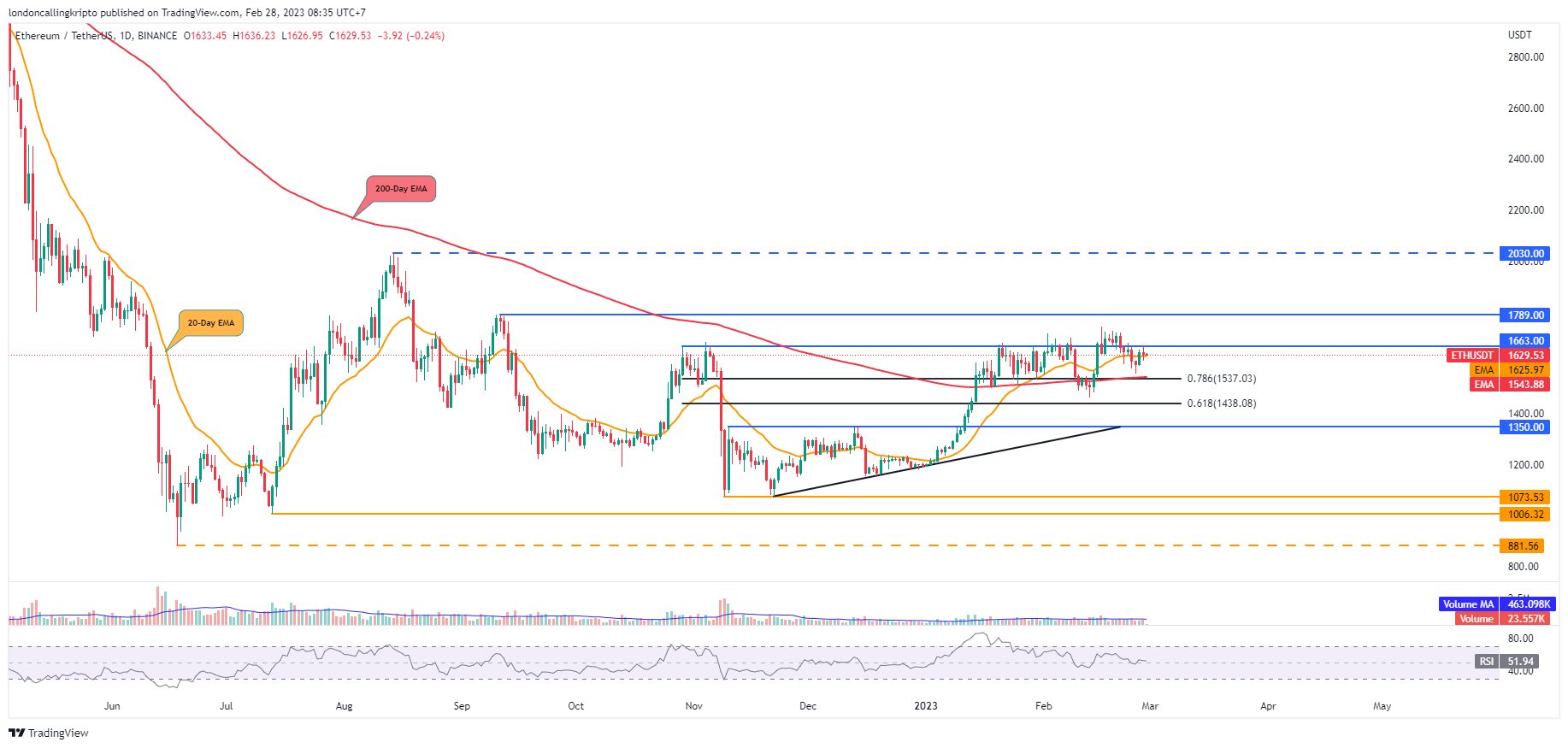 Daily candle ETH pagi ini ditutup pada harga $1.633, level tertinggi berada pada harga $1.665, dan level terendah berada pada harga $1.608.