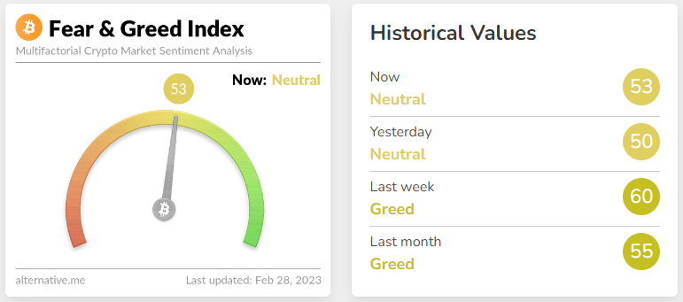 Sentimen pasar kripto kembali membaik, setelah Bitcoin dan diikuti oleh keseluruhan altocin berhasil rebound bergerak naik. Fear and greed index naik tiga poin, ditutup pada level 53, dengan kategori Neutral.