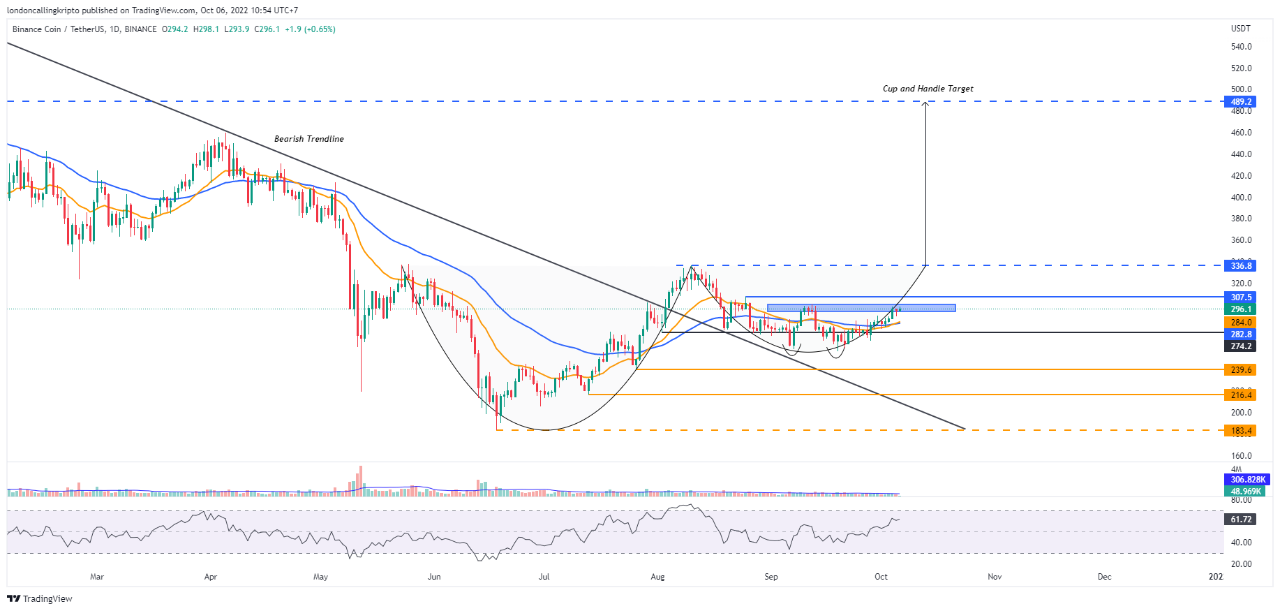 Puncak bullish pada 10 Agustus di level $336,8 masih menjadi target utama laju bullish BNB saat ini dan sebagai validasi terbentuknya handle pada cup and handle pattern.