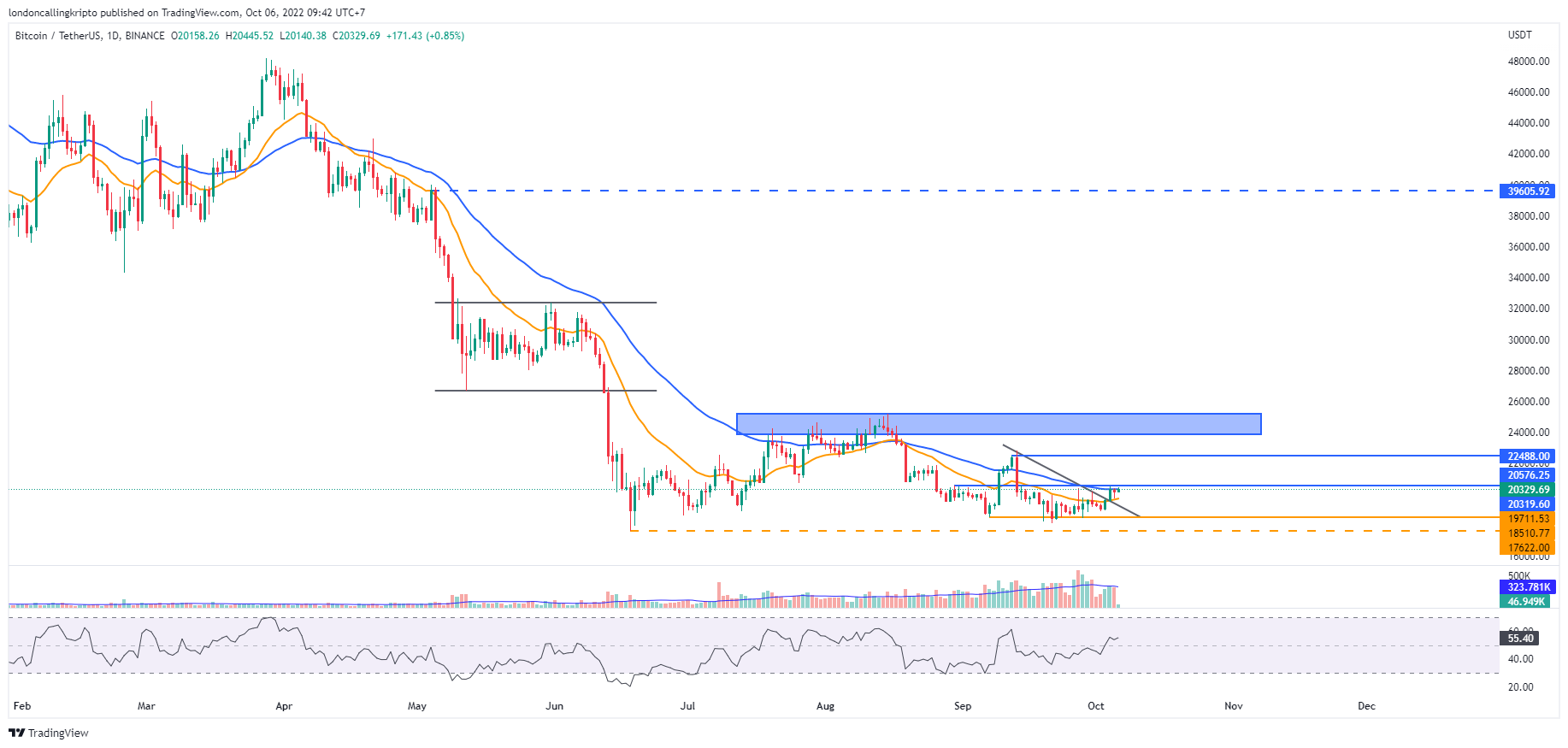 Portalkripto.com — Harga Bitcoin jatuh pada perdagangan Kamis, 6 Oktober 2022, pagi di Asia namun masin bertahan di atas support line US$20.000. Begitu juga dengan Ethereum dengan kandil harian yang ditutup merah dengan penurunan sebesar 0,68%. Dari 10 koin teratas berdasarkan market cap, hanya XRP yang masih naik.