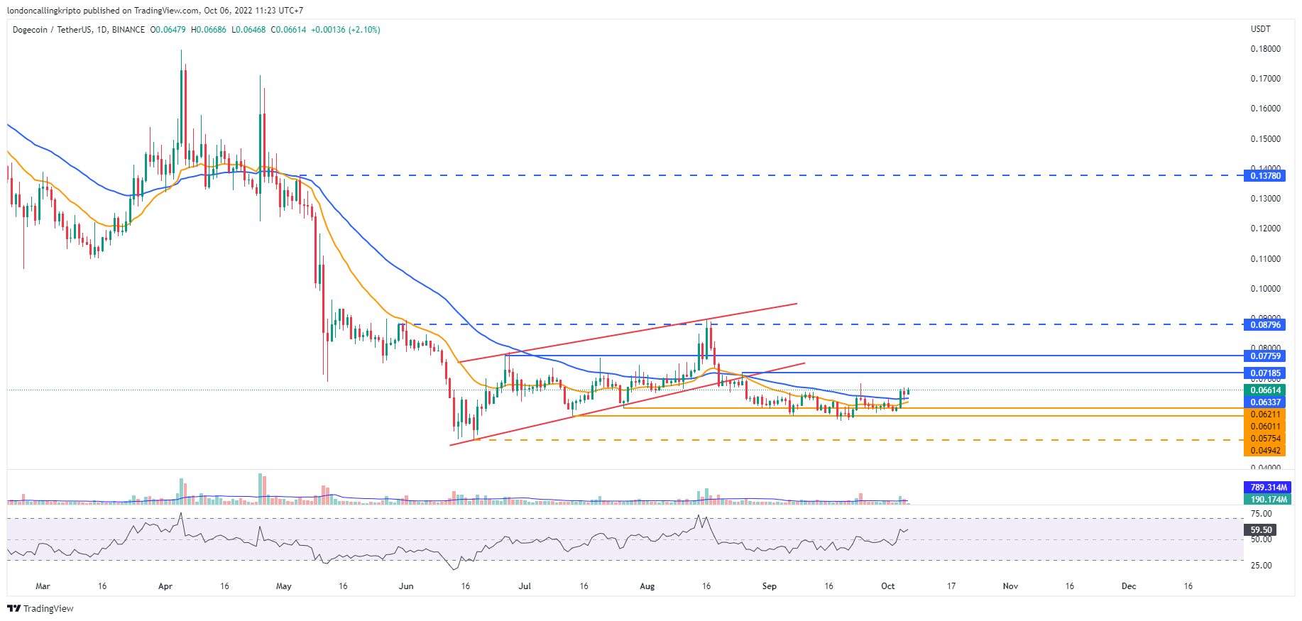 Pergerakan harga DOGE kembali naik setelah laju penurunan pada 2 Oktober tertahan support di level $0,06011. Pumping pada 4 Oktober berhasil breakout 20-day dan 50-day EMA sebagai dinamis resistance.