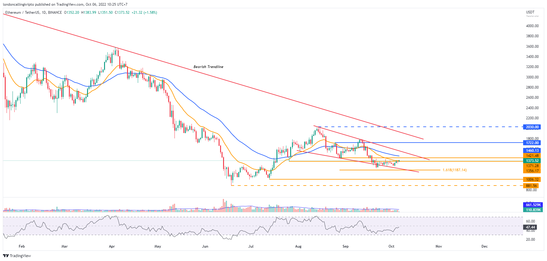 50-Day EMA pada level $1.460 menjadi target naik selanjutnya apabila pergerakan harga ETH mampu mempertahankan laju naik nya dan didukung oleh aksi beli yang tinggi.