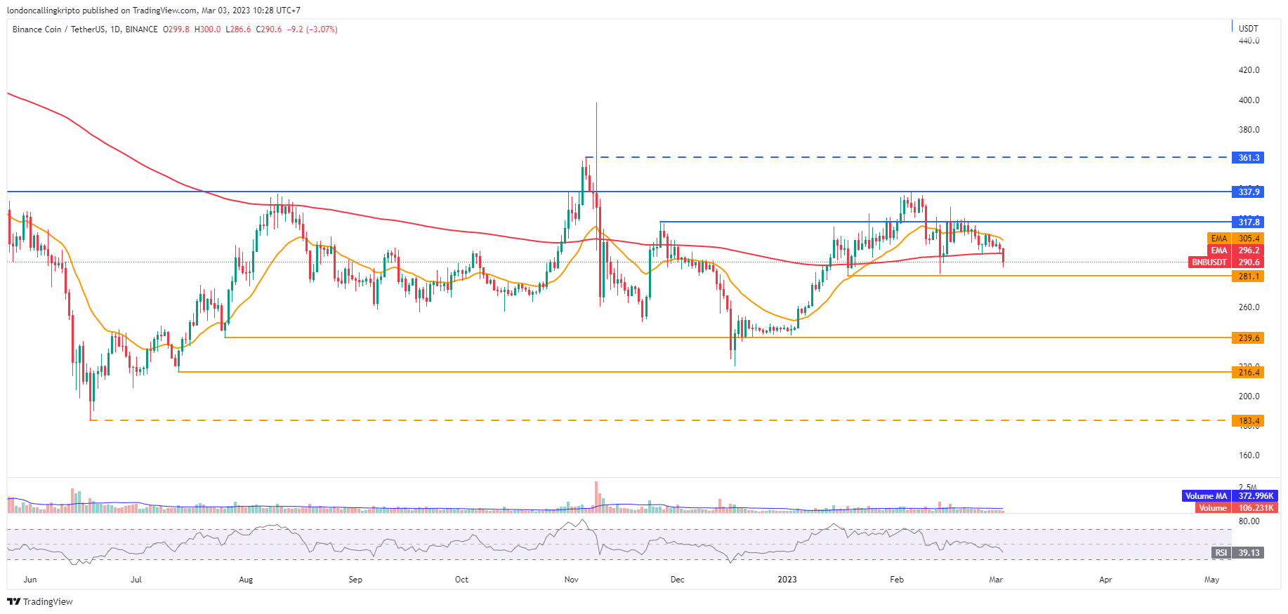 Saat artikel ini dibuat, pergerakan harga BNB berhasil breakdown 200-day EMA sebagai dinamis support pada level $296,2.