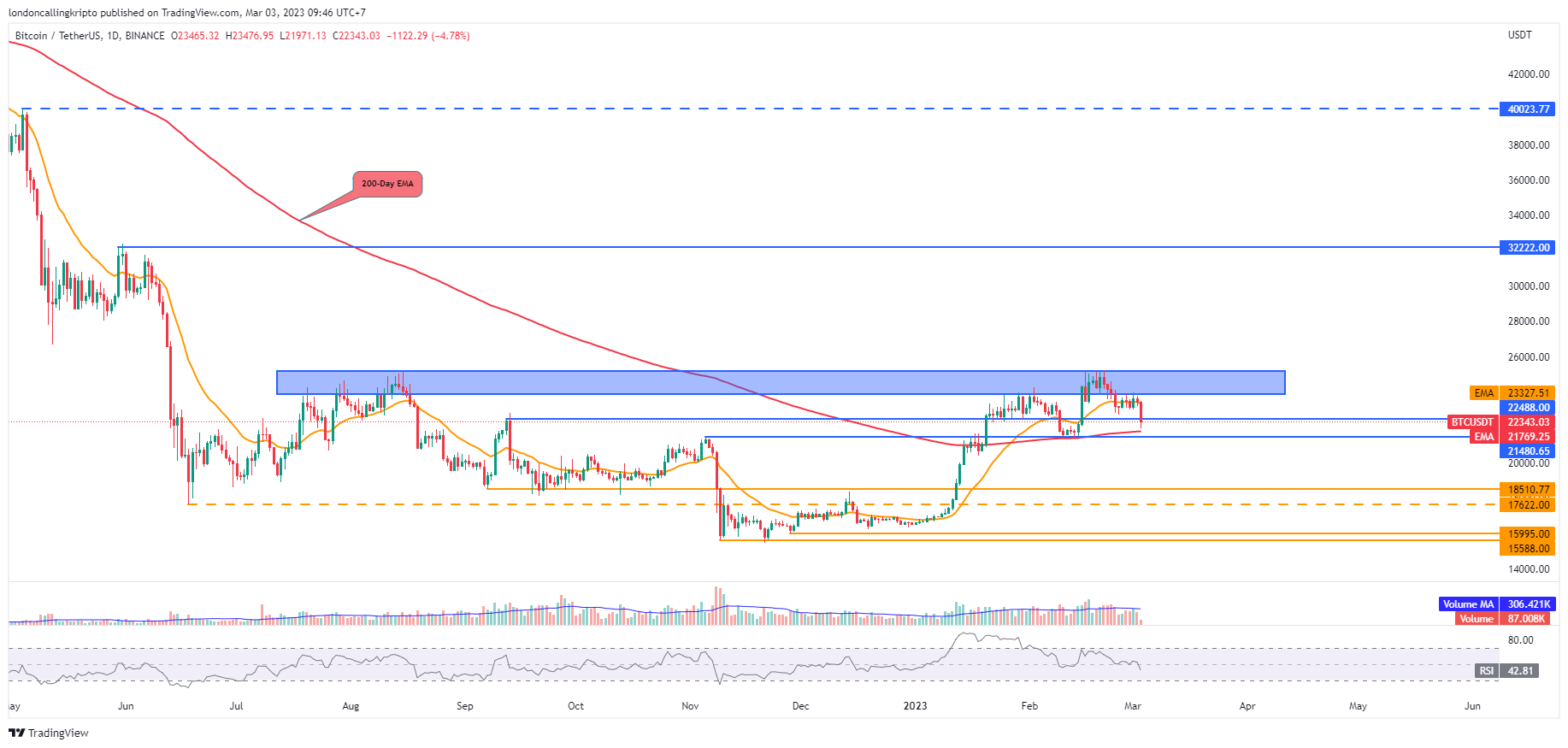 Penurunan harga tersebut kemungkinan akan retest area support pada level $21.768 yang merupakan 200-day EMA dan harga tertinggi pada 5 November 2022.
