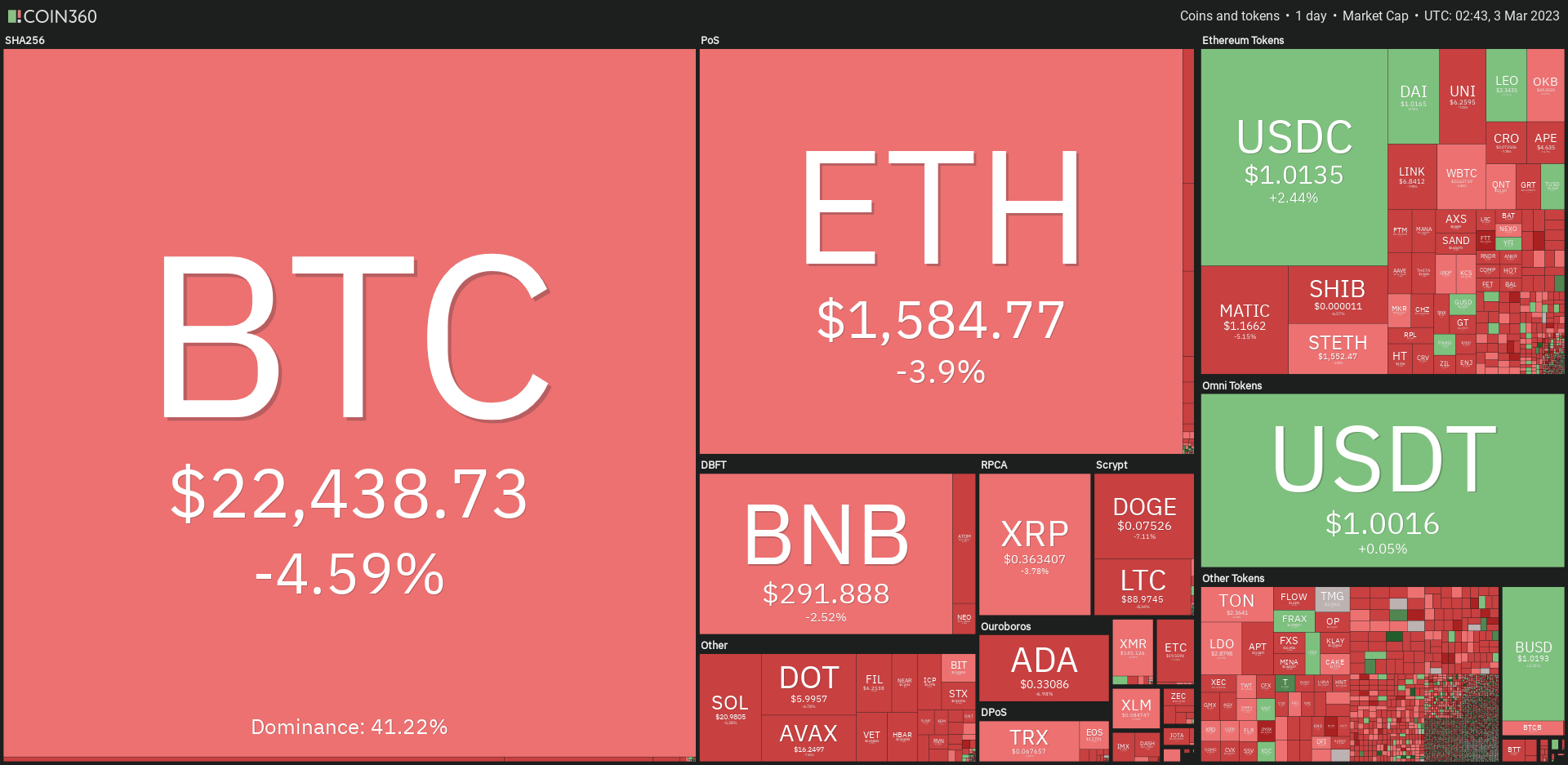 BNB masih konsisten berada pada jalur downtrend setelah konsisten bergerak dibawah 20-day EMA sejak 23 Februari. Kandil harian Bitcoin ditutup merah dengan penurunan sebesar 0,96%.