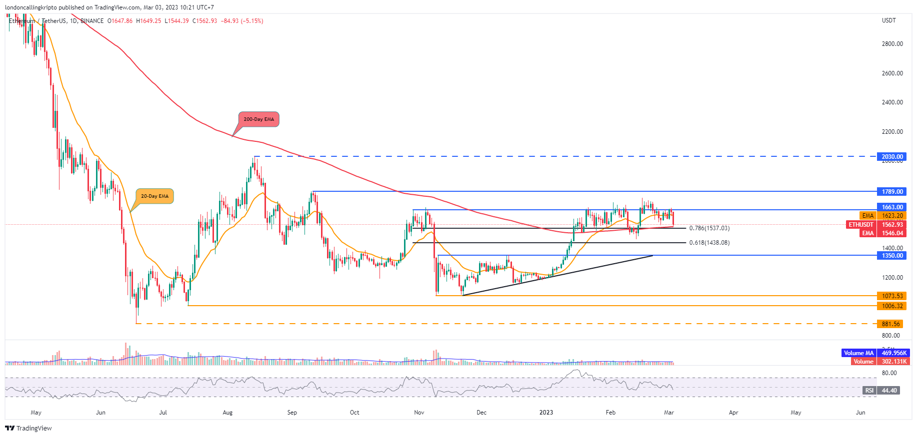 Saat artikel ini dibuat, pergerakan harga ETH mengalami dump atau penurunan dengan cepat dan retest 200-day EMA di level $1.567.