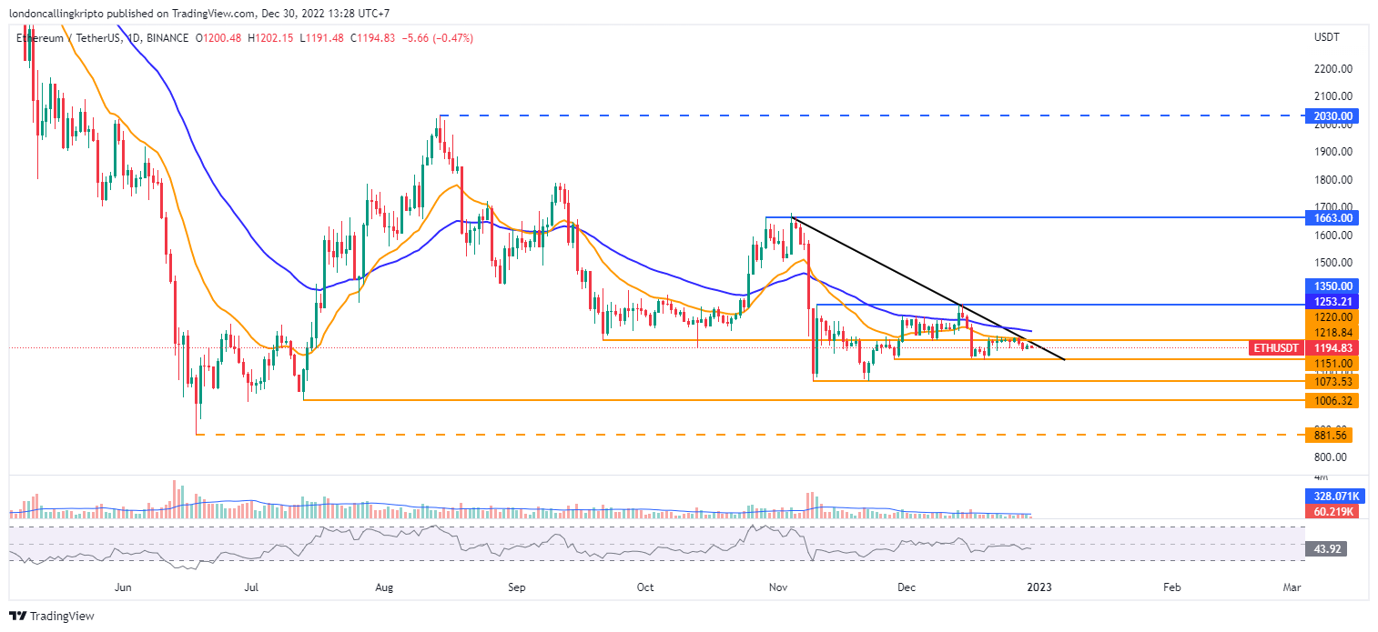Harga terendah pada penutupan kandil harian 28 November di level $1.151 masih mejadi tahanan terdekat apabila harga ETH kembali koreksi.