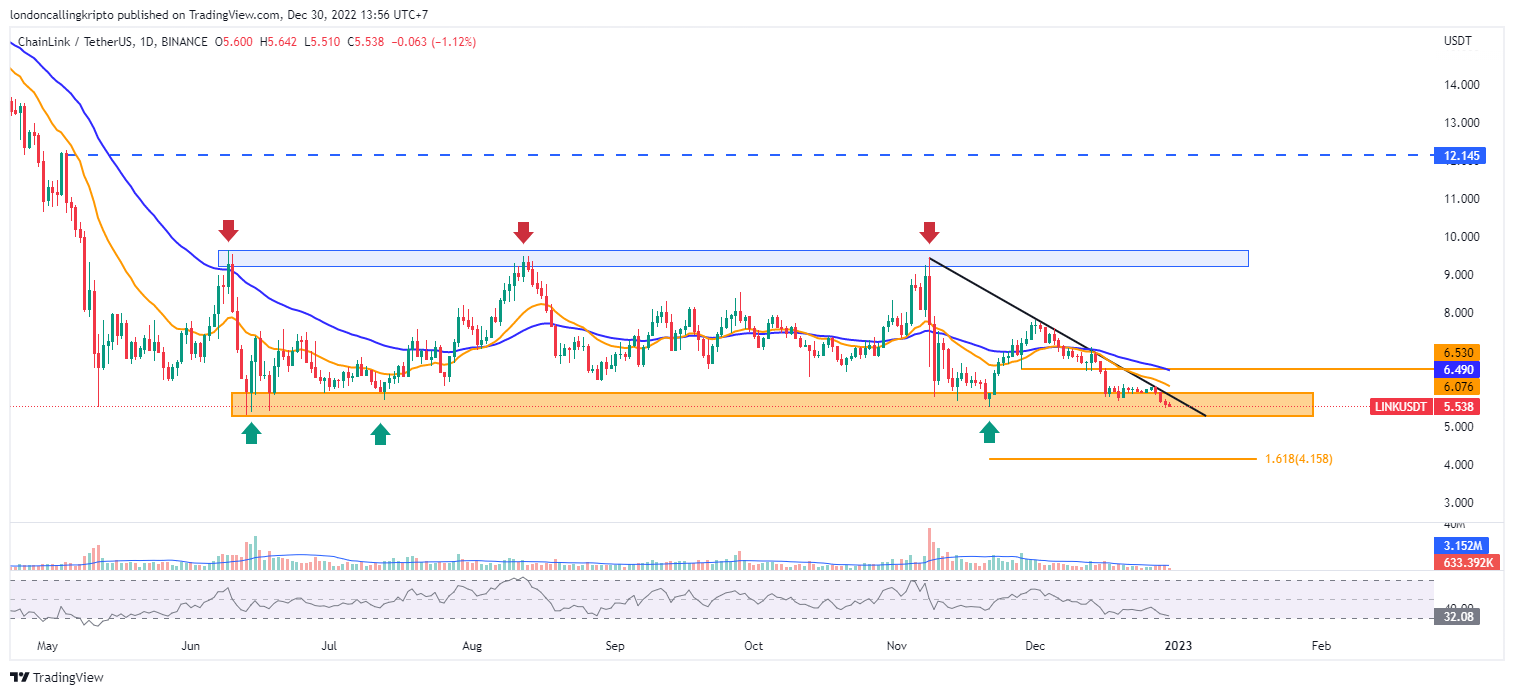 Pergerakan harga LINK saat ini berada pada major support di level $5,283-$5,886. Tahanan tersebut merupakan benteng pertahanan terakhir.