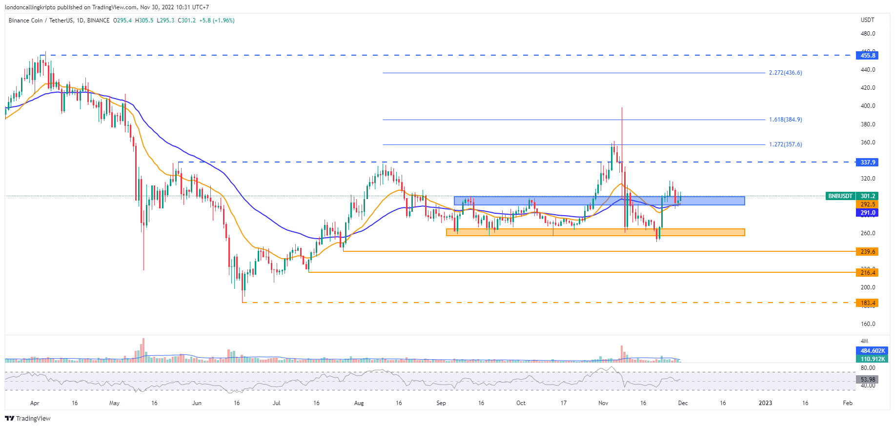 Dinamis support pada 20-day EMA di level $292,4 kembali menjadi tahanan yang solid untuk menahan laju penurunan harga BNB.