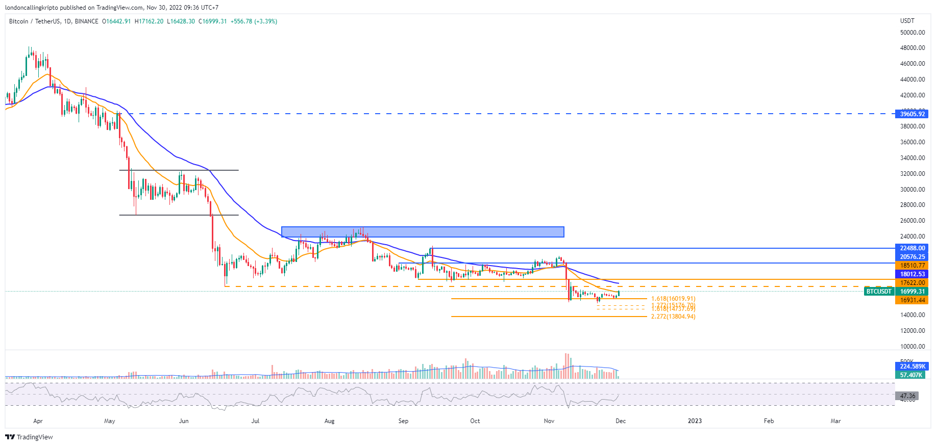Pergerakan harga Bitcoin berhasil bounce, setelah laju penurunan pada penutupan kandil harian 28 November tertahan support di level $16.019.